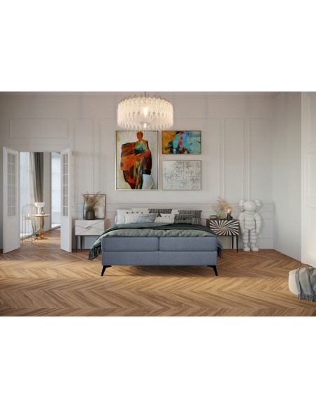 Kontinentalseng med opbevaring, fremstillet i mørkeblå polyester. Sengen måler 180 x 200 cm i bredde og dybde og 55 cm i højden. Madrasserne er med 7 komfortzoner for optimal komfort.