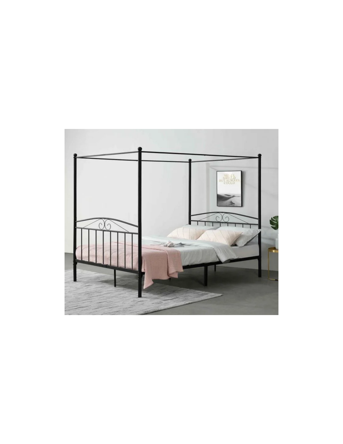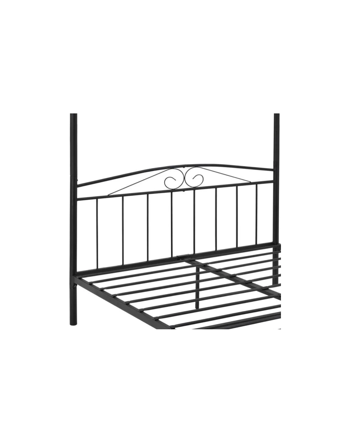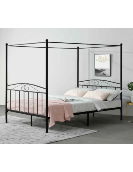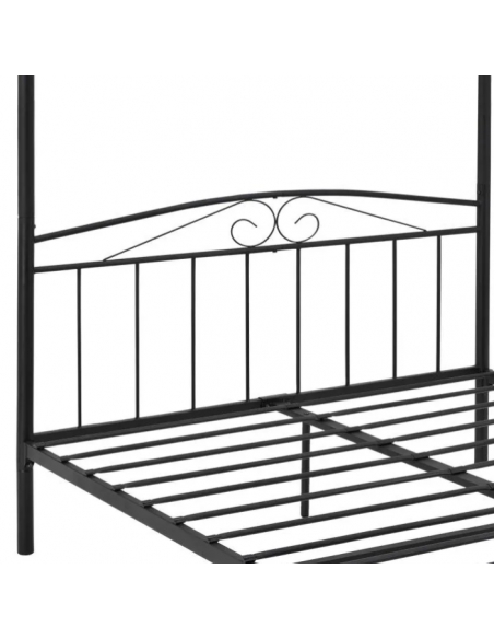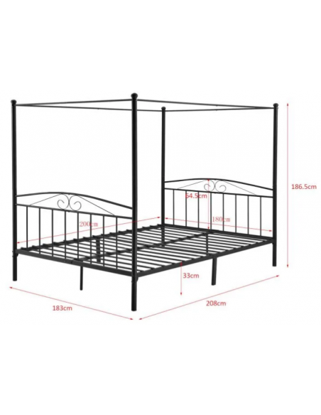 Himmelseng med gavl, udført i et design af sortlakeret stål. Sengen måler 33 - 186,5 cm i højden og 208 x 183 cm i bredde og dybde og passer til madrasser med målene 200 x 180 cm.
