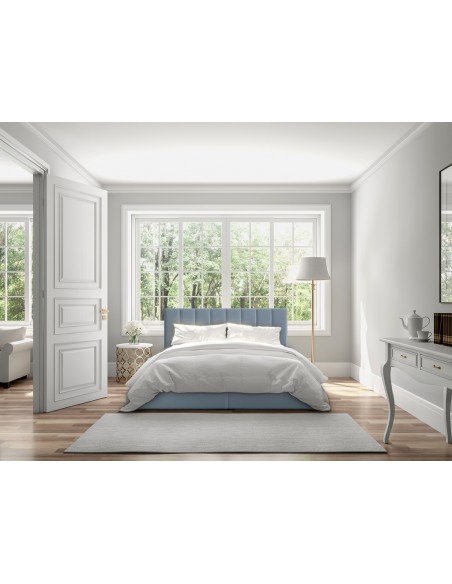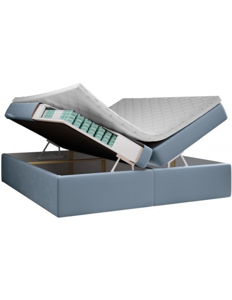 Kontinentalseng med opbevaring og sengegavl, fremstillet i blågrå velour. Sengen måler 200 x 200 / 211 cm i bredde og dybde og 64 / 118 cm i højden. Madrasserne er med 7 komfortzoner for optimal komfort.