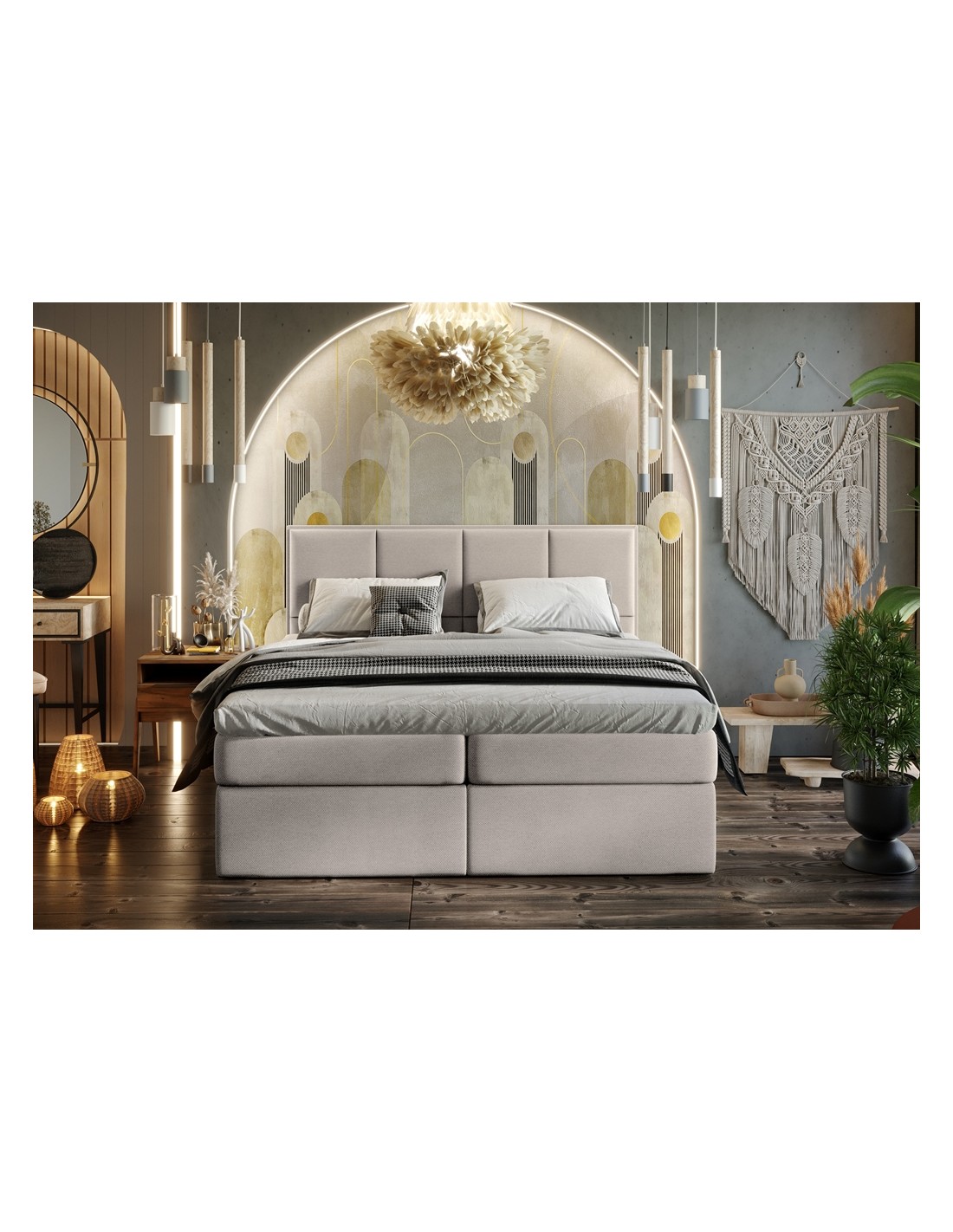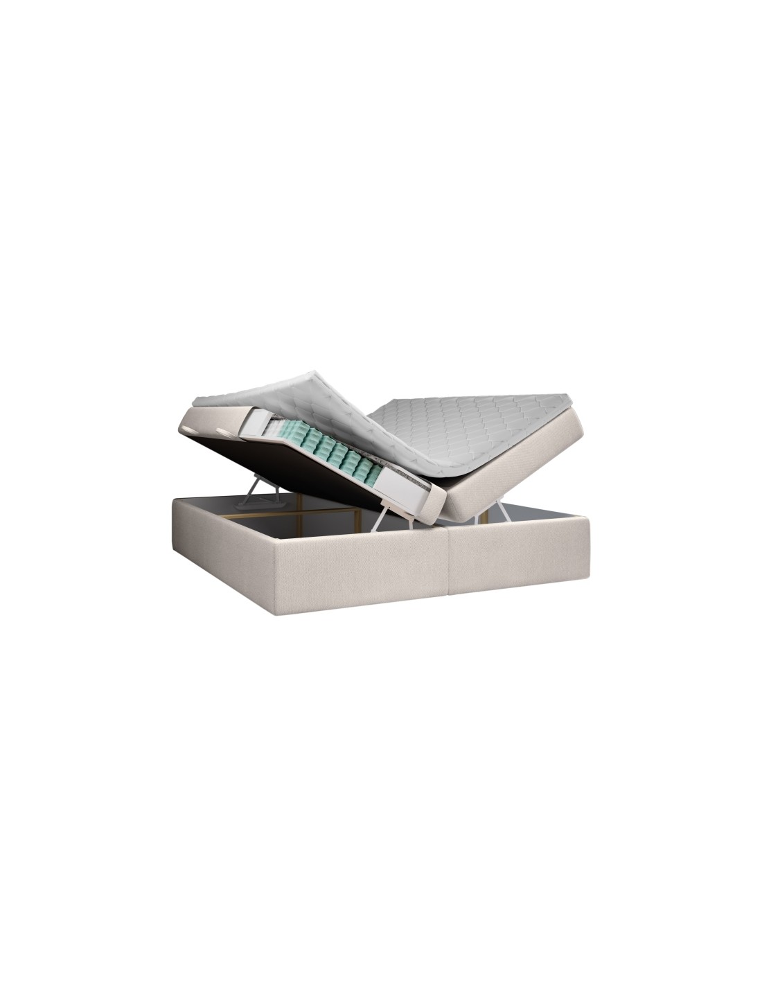 Kontinentalseng med opbevaring og sengegavl, fremstillet i beige polyester. Sengen måler 200 x 200 / 211 cm i bredde og dybde og 64 / 118 cm i højden. Madrasserne er med 7 komfortzoner for optimal komfort.