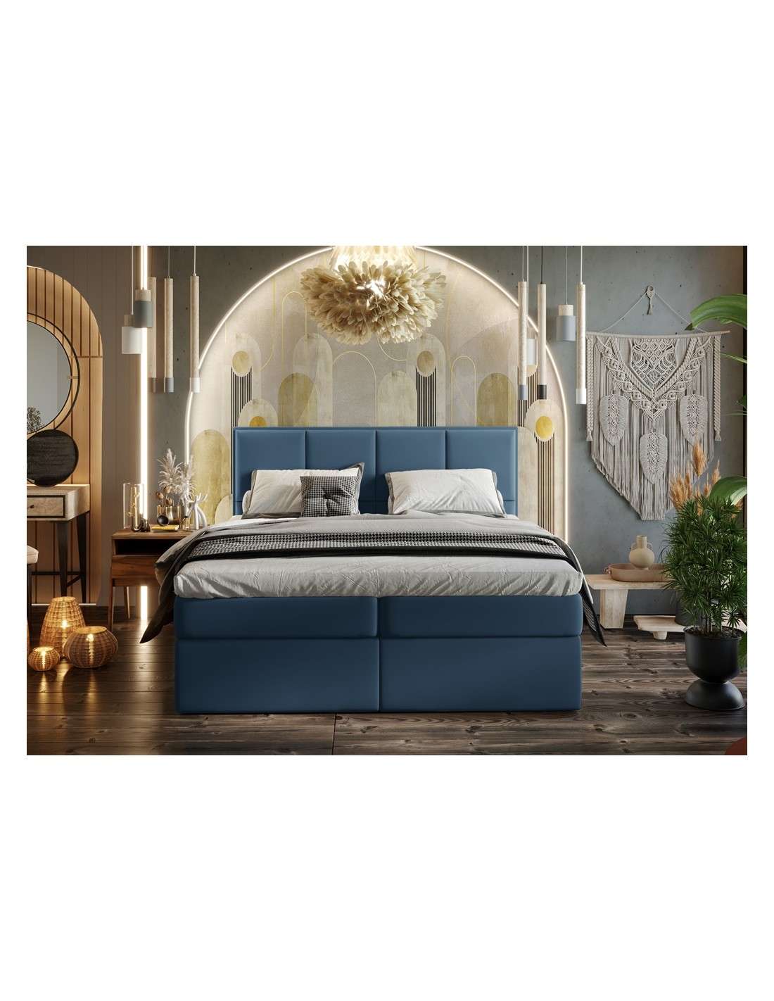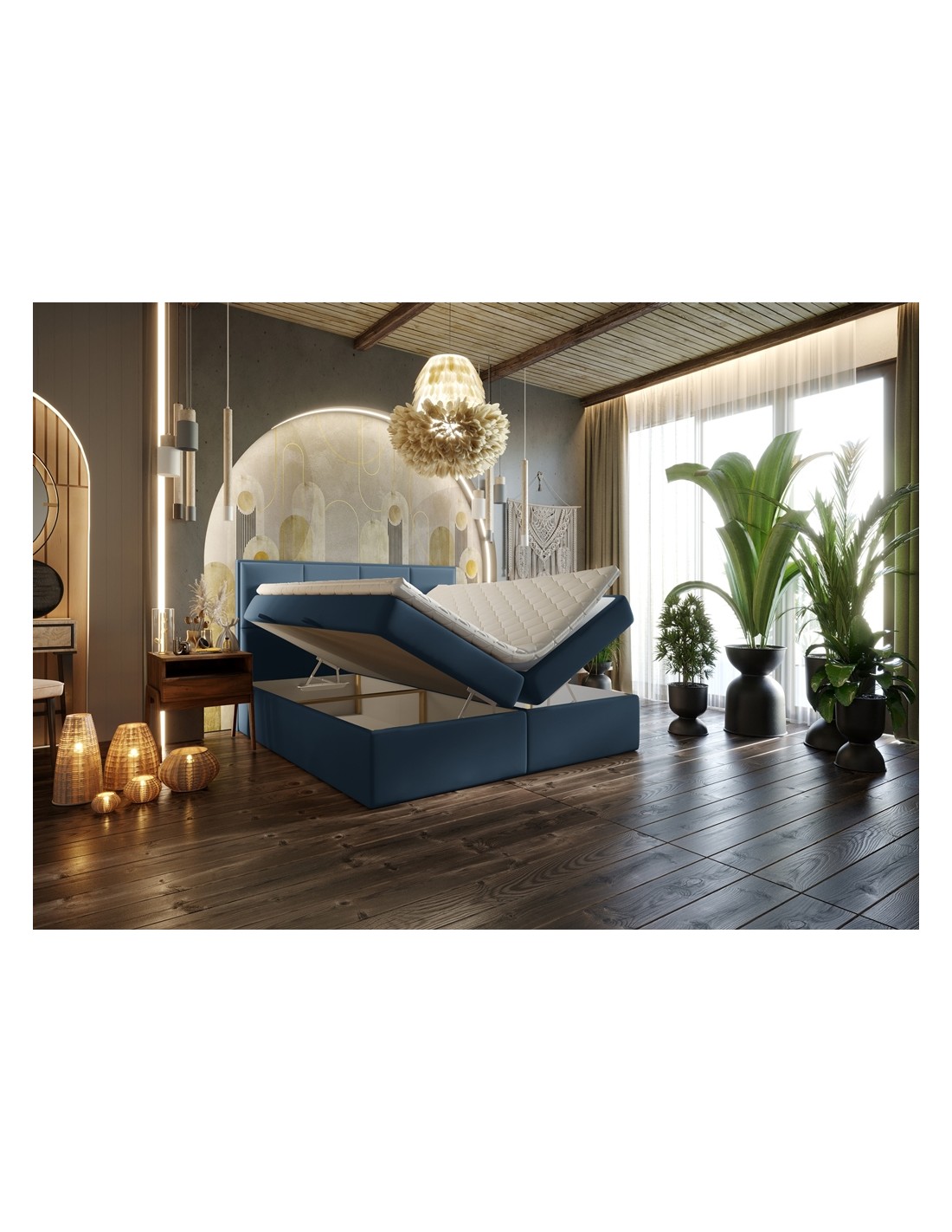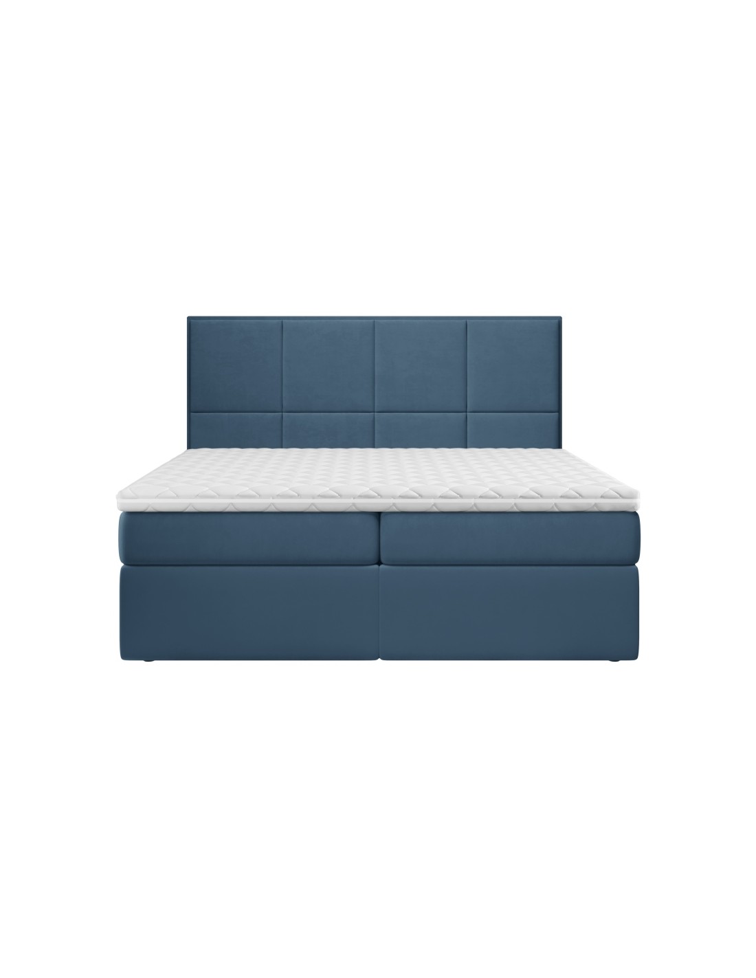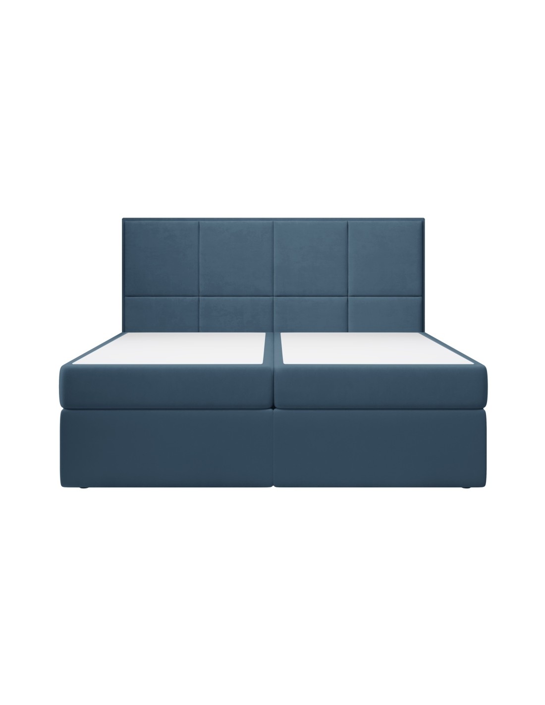 Kontinentalseng med opbevaring og sengegavl, fremstillet i blå velour. Sengen måler 200 x 200 / 211 cm i bredde og dybde og 64 / 118 cm i højden. Madrasserne er med 7 komfortzoner for optimal komfort.