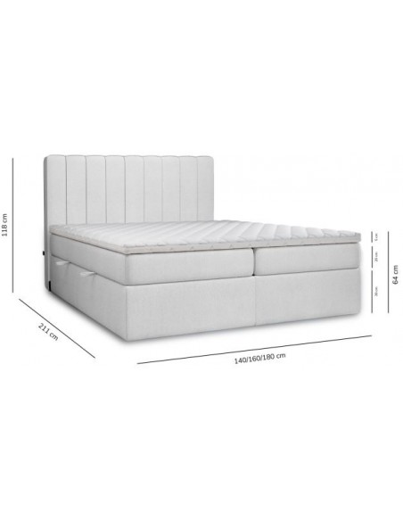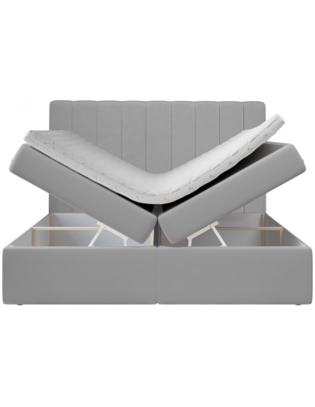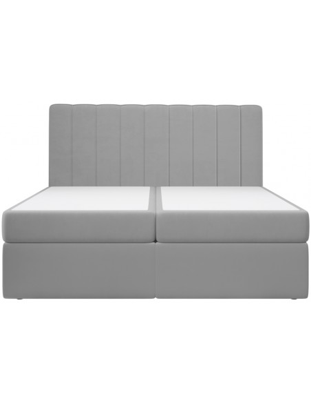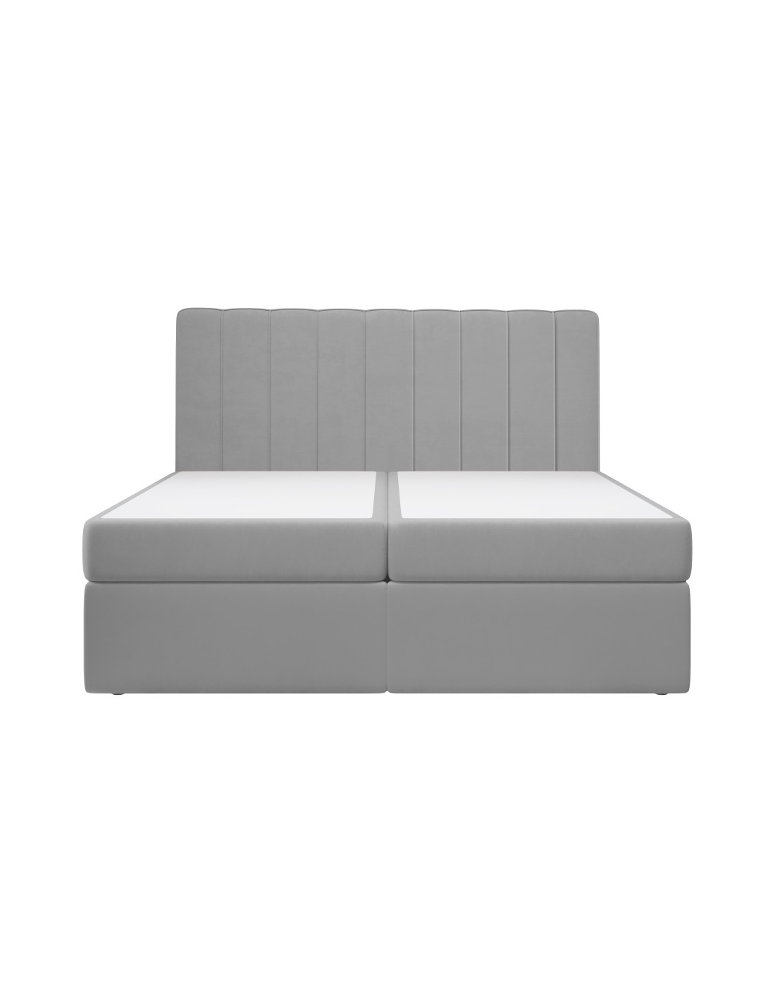 Kontinentalseng med opbevaring og sengegavl, fremstillet i lysegrå velour. Sengen måler 200 x 200 / 211 cm i bredde og dybde og 64 / 118 cm i højden. Madrasserne er med 7 komfortzoner for optimal komfort.