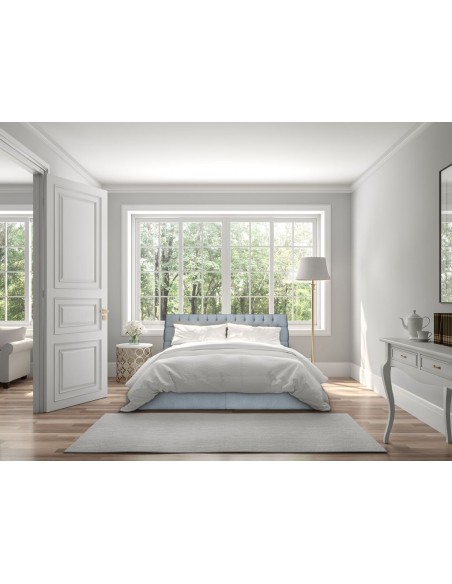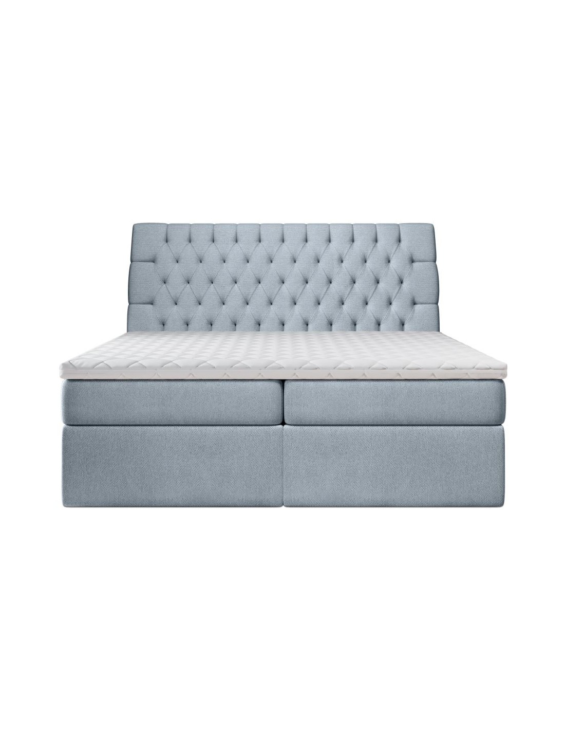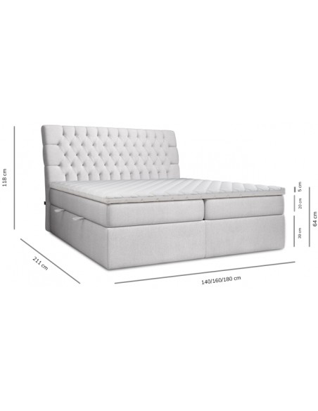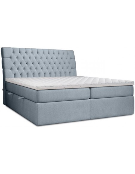 Kontinentalseng med opbevaring og sengegavl, fremstillet i blågrå polyester. Sengen måler 200 x 200 / 211 cm i bredde og dybde og 64 / 118 cm i højden. Madrasserne er med 7 komfortzoner for optimal komfort.