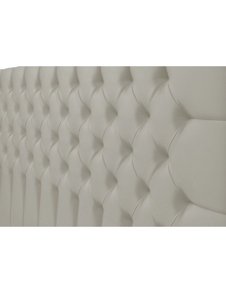 Kontinentalseng med opbevaring og sengegavl, fremstillet i lys beige velour. Sengen måler 200 x 200 / 211 cm i bredde og dybde og 55 / 120 cm i højden. Madrasserne er med 7 komfortzoner for optimal komfort.