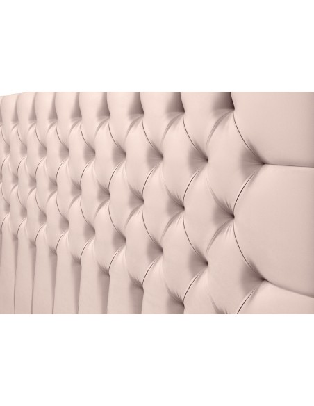 Kontinentalseng med opbevaring og sengegavl, fremstillet i pastelpink velour. Sengen måler 200 x 200 / 211 cm i bredde og dybde og 55 / 120 cm i højden. Madrasserne er med 7 komfortzoner for optimal komfort.