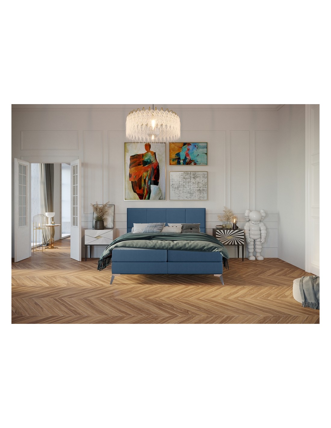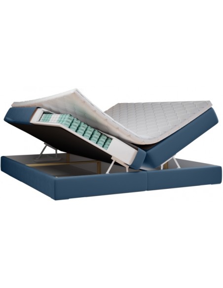 Kontinentalseng med opbevaring og sengegavl, fremstillet i blå velour. Sengen måler 200 x 200 / 211 cm i bredde og dybde og 55 / 123 cm i højden. Madrasserne er med 7 komfortzoner for optimal komfort.