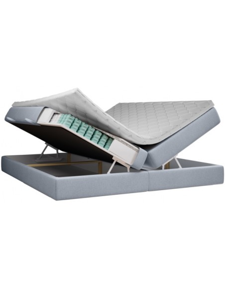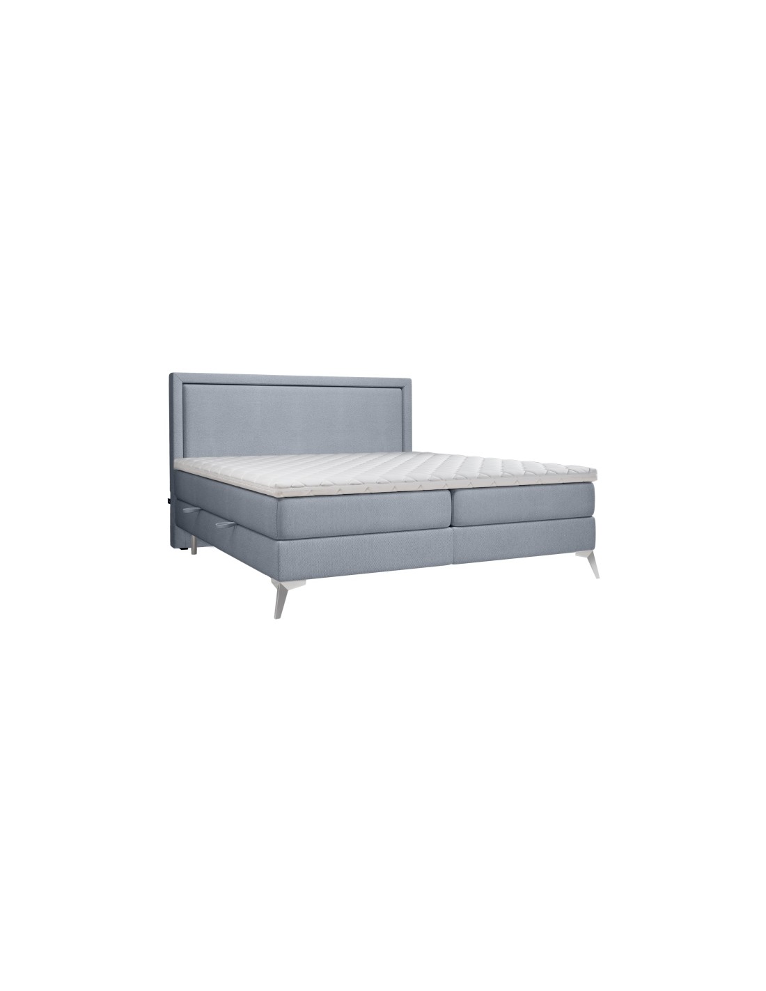 Kontinentalseng med opbevaring og sengegavl, fremstillet i blågrå polyester. Sengen måler 200 x 200 / 211 cm i bredde og dybde og 55 / 118 cm i højden. Madrasserne er med 7 komfortzoner for optimal komfort.