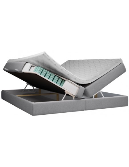 Kontinentalseng med opbevaring og sengegavl, fremstillet i mørkegrå polyester. Sengen måler 200 x 200 / 211 cm i bredde og dybde og 55 / 118 cm i højden. Madrasserne er med 7 komfortzoner for optimal komfort.