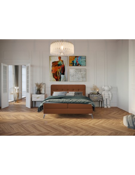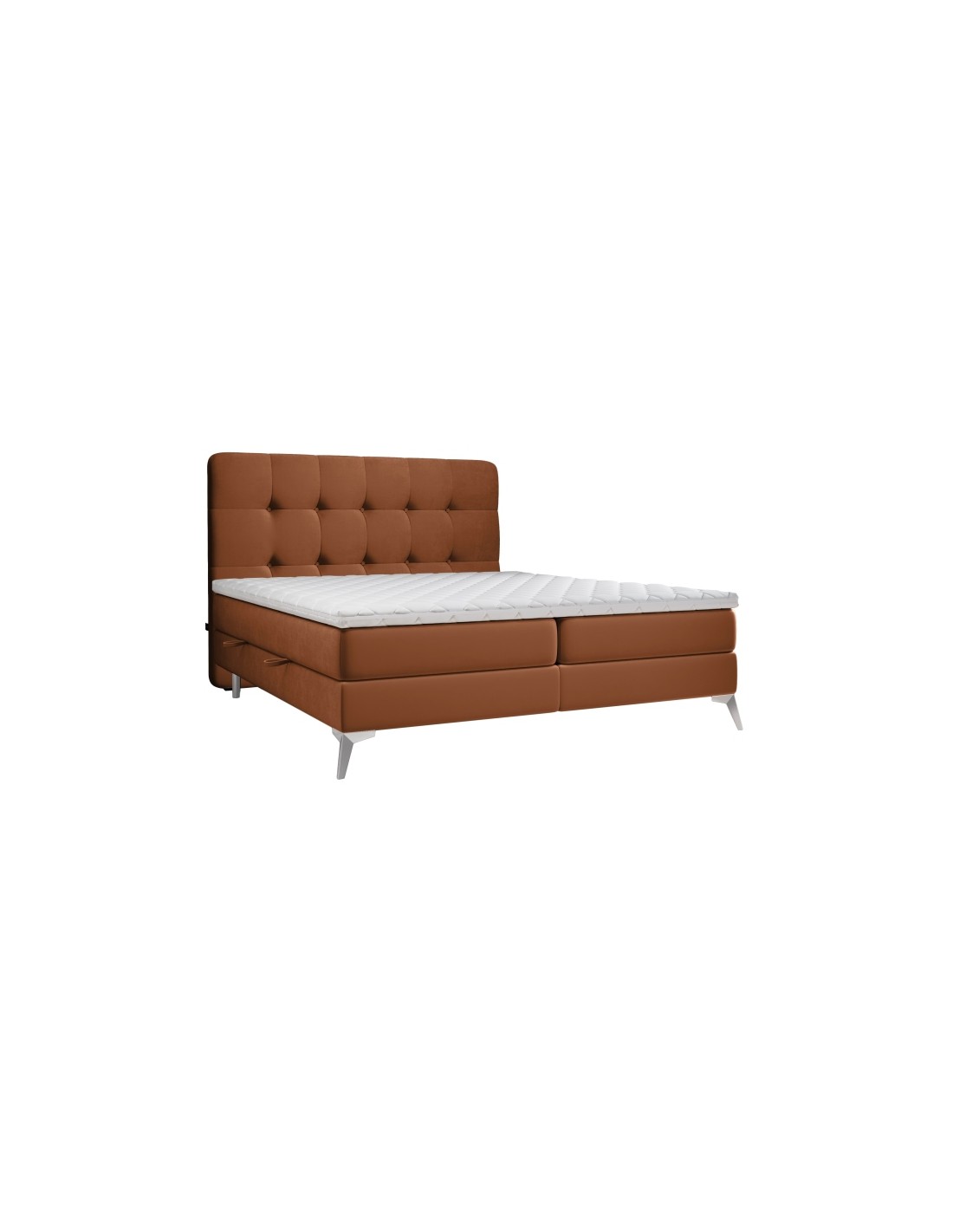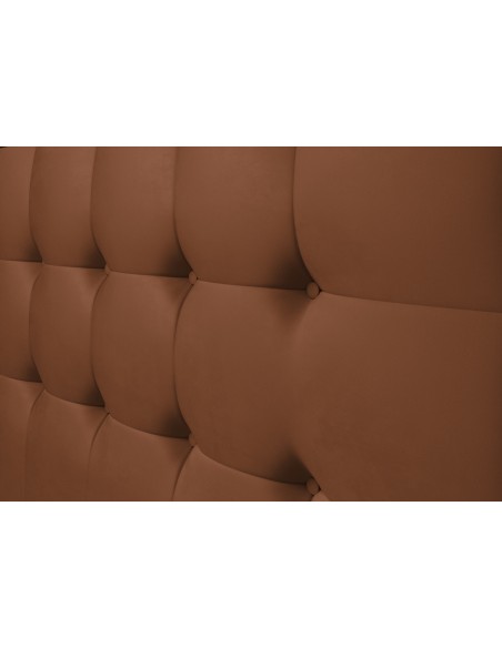 Kontinentalseng med opbevaring og sengegavl, fremstillet i kobberfarvet velour. Sengen måler 200 x 200 / 211 cm i bredde og dybde og 55 / 118 cm i højden. Madrasserne er med 7 komfortzoner for optimal komfort.