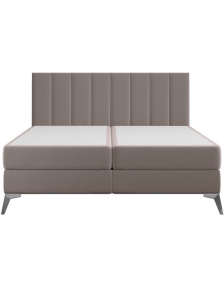 Kontinentalseng med opbevaring og sengegavl, fremstillet i mørk beige velour. Sengen måler 200 x 200 / 211 cm i bredde og dybde og 55 / 118 cm i højden. Madrasserne er med 7 komfortzoner for optimal komfort.