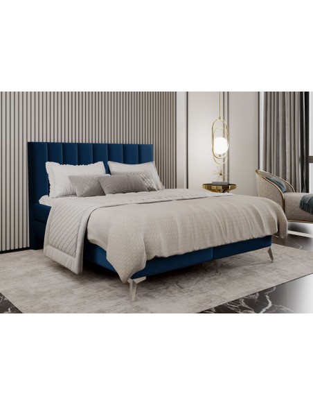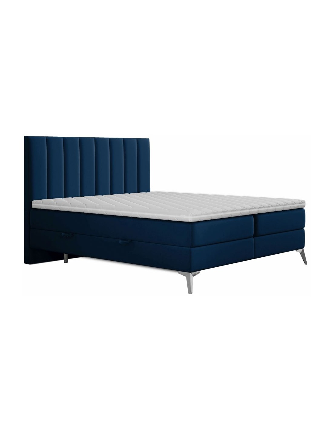 Kontinentalseng med opbevaring og sengegavl, fremstillet i dyb blå velour. Sengen måler 200 x 200 / 211 cm i bredde og dybde og 55 / 118 cm i højden. Madrasserne er med 7 komfortzoner for optimal komfort.