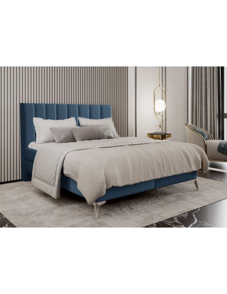 Kontinentalseng med opbevaring og sengegavl, fremstillet i blå velour. Sengen måler 200 x 200 / 211 cm i bredde og dybde og 55 / 118 cm i højden. Madrasserne er med 7 komfortzoner for optimal komfort.