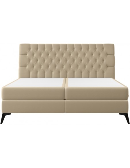 Kontinentalseng med opbevaring og sengegavl, fremstillet i guldbeige velour. Sengen måler 200 x 200 / 211 cm i bredde og dybde og 55 / 118 cm i højden. Madrasserne er med 7 komfortzoner for optimal komfort.