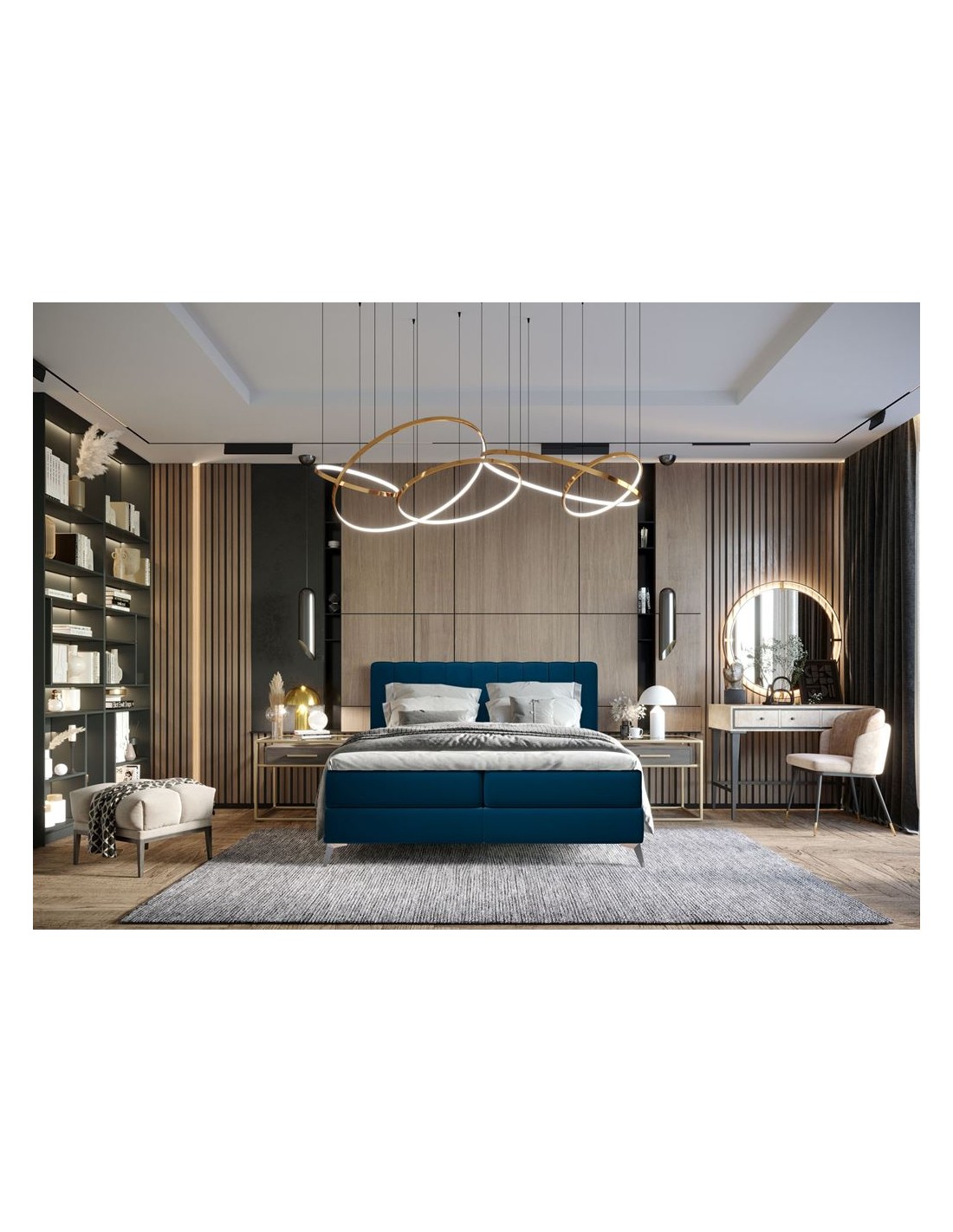 Kontinentalseng med opbevaring og sengegavl, fremstillet i dyb blå velour. Sengen måler 200 x 200 / 211 cm i bredde og dybde og 55 / 120 cm i højden. Madrasserne er med 7 komfortzoner for optimal komfort.