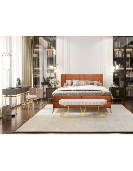 Kontinentalseng med opbevaring og sengegavl, fremstillet i kobberfarvet polyester. Sengen måler 200 x 200 / 211 cm i bredde og dybde og 55 / 120 cm i højden. Madrasserne er med 7 komfortzoner for optimal komfort.