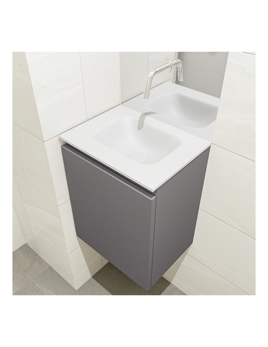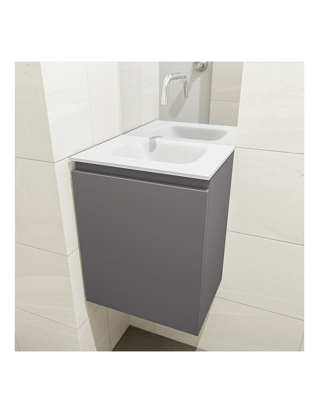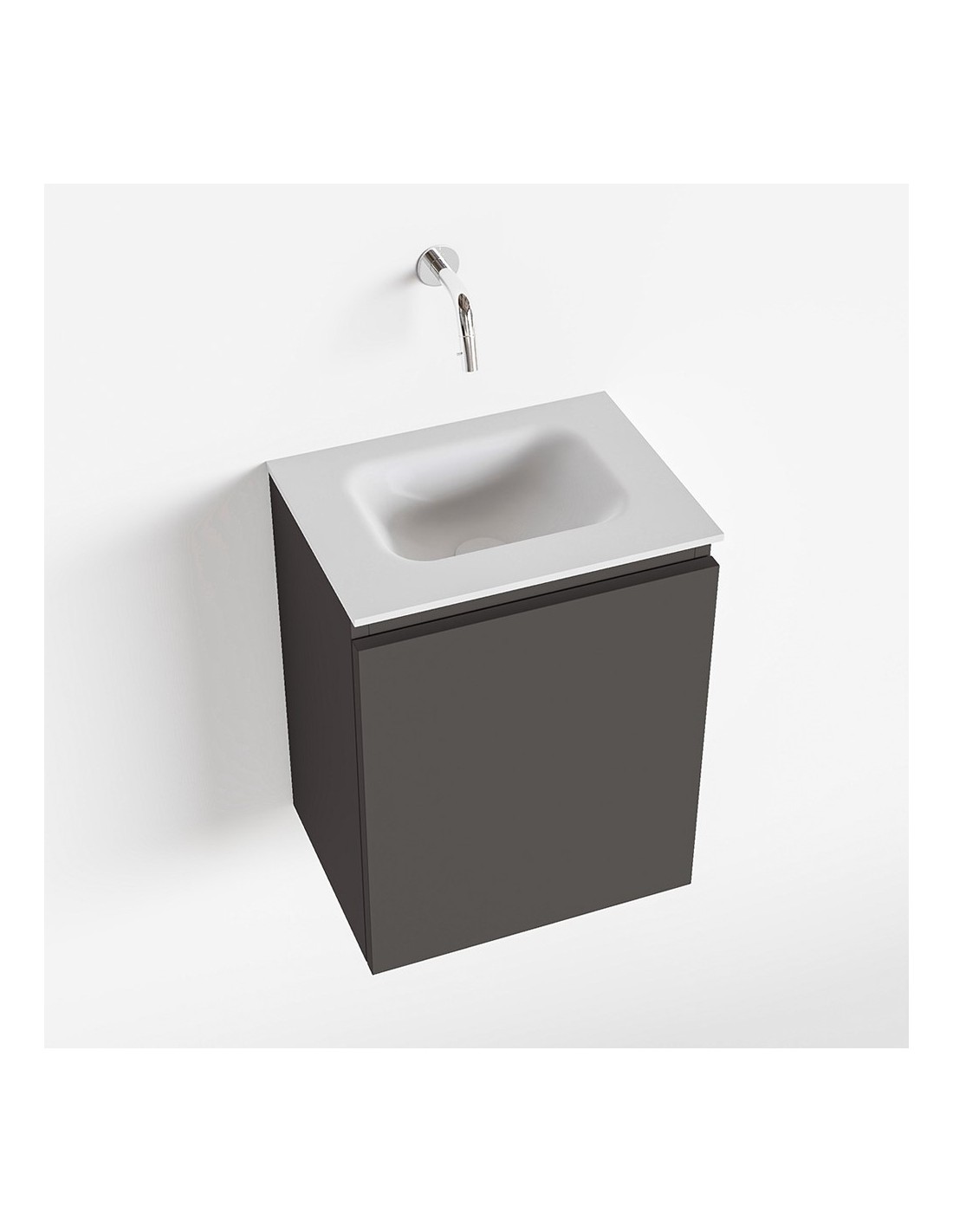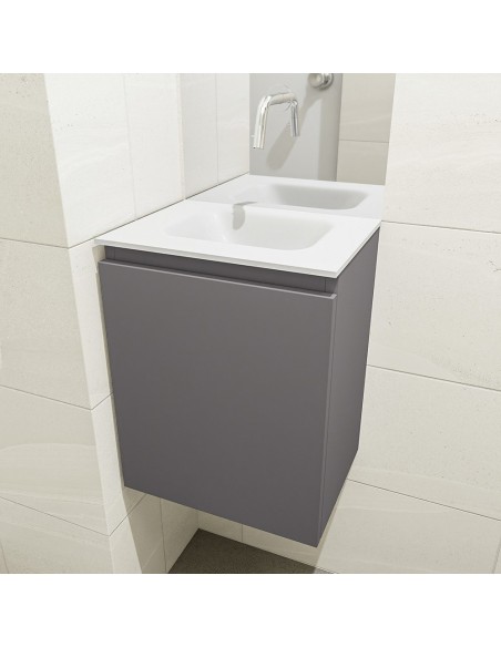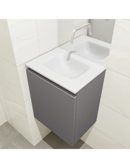 OLAN Komplet badmiljø med midt centreret håndvask til vægmonteret armatur. Badmiljøet kommer med 1 skuffe med fuldt udtræk, og er fremstillet i MDF. Håndvasken er fremstillet i talkumsfarvet (mat hvid) solid surface. Badmiljøet måler 40 cm i bredden. Det viste armatur medfølger ikke i sættet.