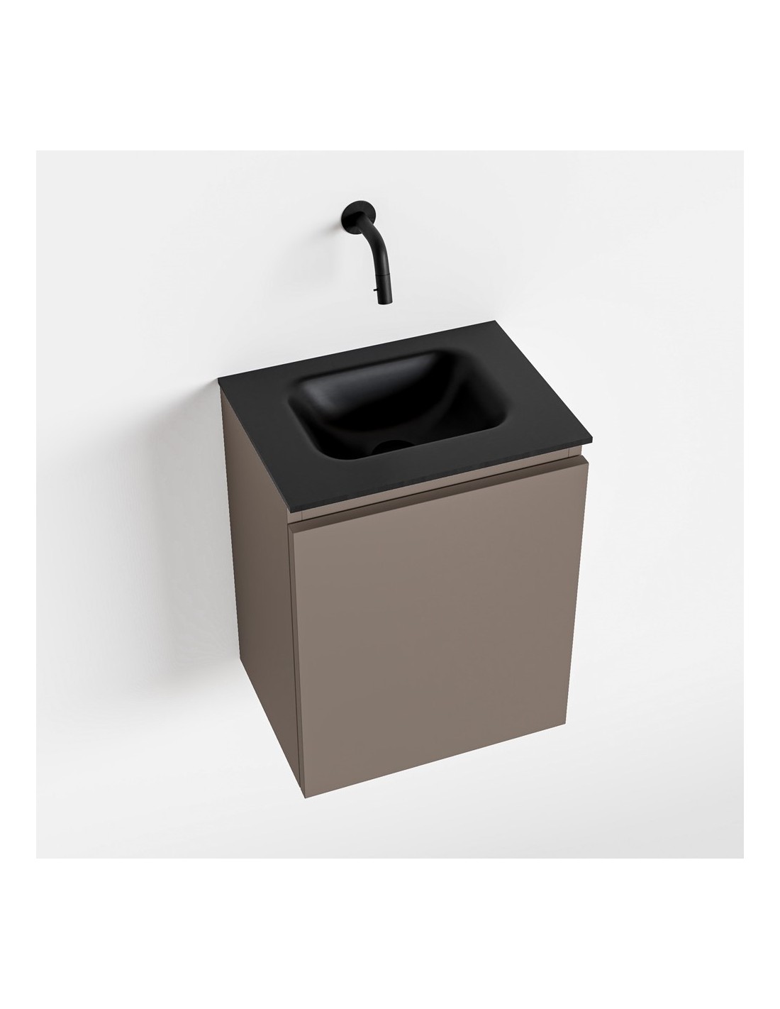 OLAN Komplet badmiljø med midt centreret håndvask til vægmonteret armatur. Badmiljøet kommer med 1 skuffe med fuldt udtræk, og er fremstillet i MDF. Håndvasken er fremstillet i sort solid surface. Badmiljøet måler 40 cm i bredden. Det viste armatur medfølger ikke i sættet.