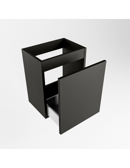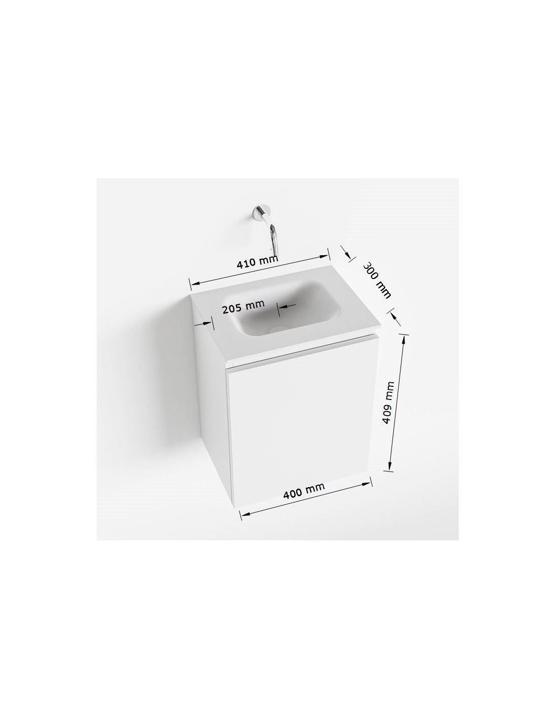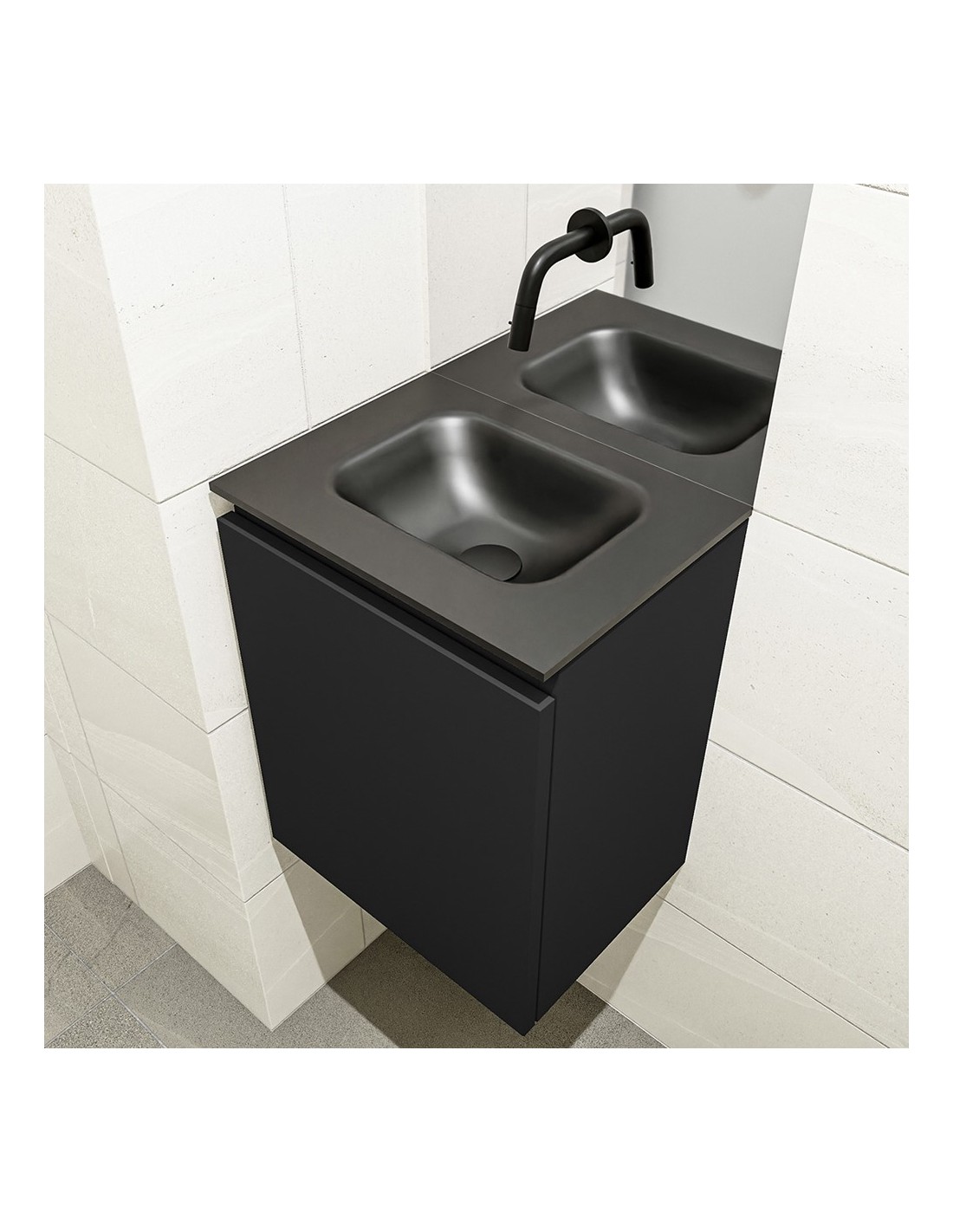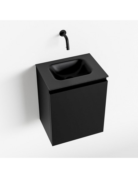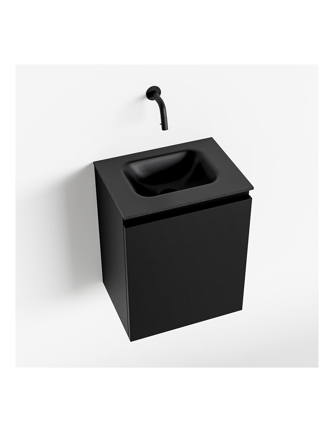 OLAN Komplet badmiljø med midt centreret håndvask til vægmonteret armatur. Badmiljøet kommer med 1 skuffe med fuldt udtræk, og er fremstillet i MDF. Håndvasken er fremstillet i sort solid surface. Badmiljøet måler 40 cm i bredden. Det viste armatur medfølger ikke i sættet.