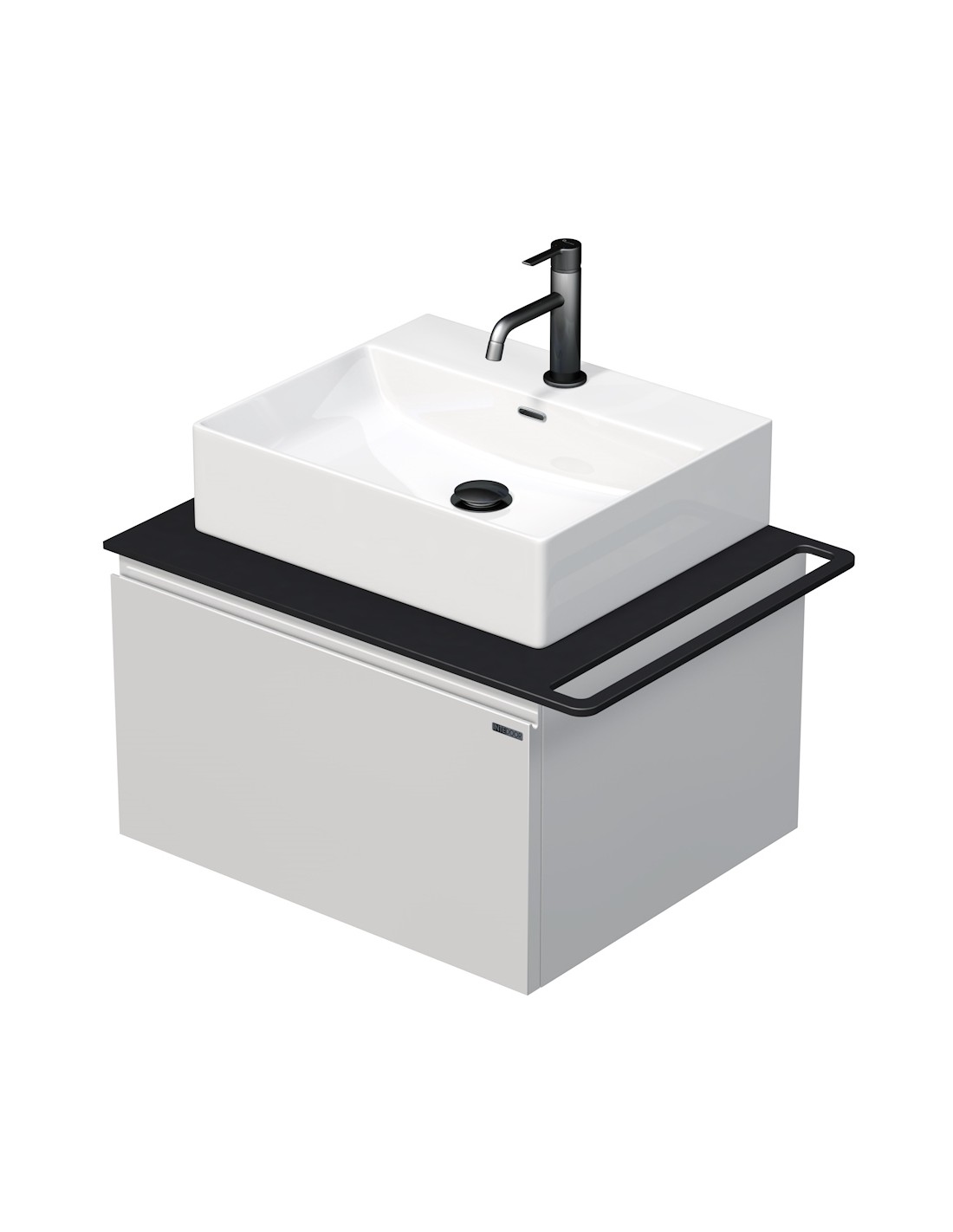 TARA Komplet badmiljø med 1 håndvask til bordmonteret armaturer. Badmiljøet kommer med 1 skuffe med softclose og er fremstillet i HPL og MDF. Håndvasken er fremstillet i keramik. Badmiljøet måler 68 cm i bredden. Det viste armatur og bundventil medfølger ikke i sættet.