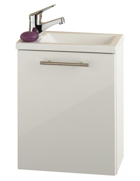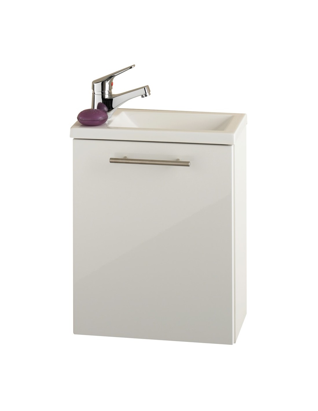Komplet badmiljø med vask til det lille badeværelse eller gæstetoilet, udført i et design af mdf og mineralsten. Badmiljøet måler 50,5 cm i højden og 40 x 22 cm i bredde og dybde.