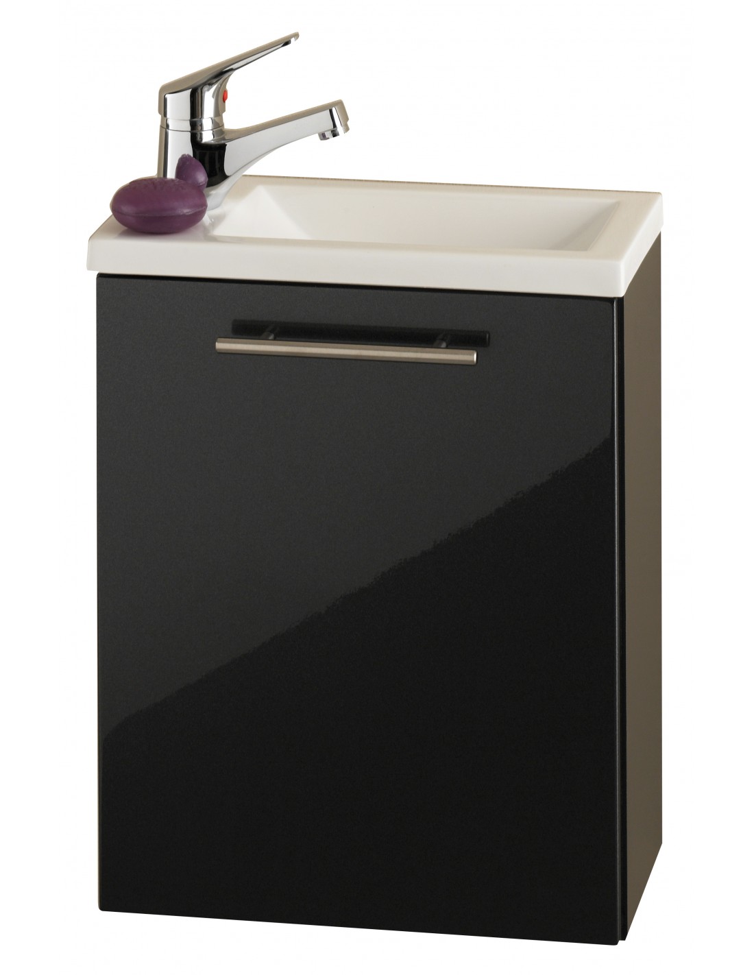 Komplet badmiljø med vask til det lille badeværelse eller gæstetoilet, udført i et design af mdf og mineralsten. Badmiljøet måler 50,5 cm i højden og 40 x 22 cm i bredde og dybde.