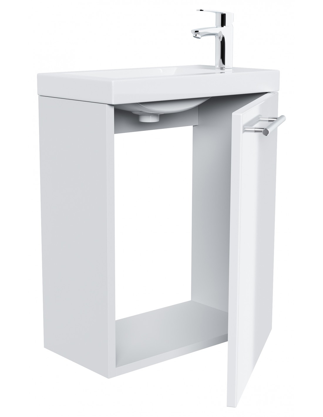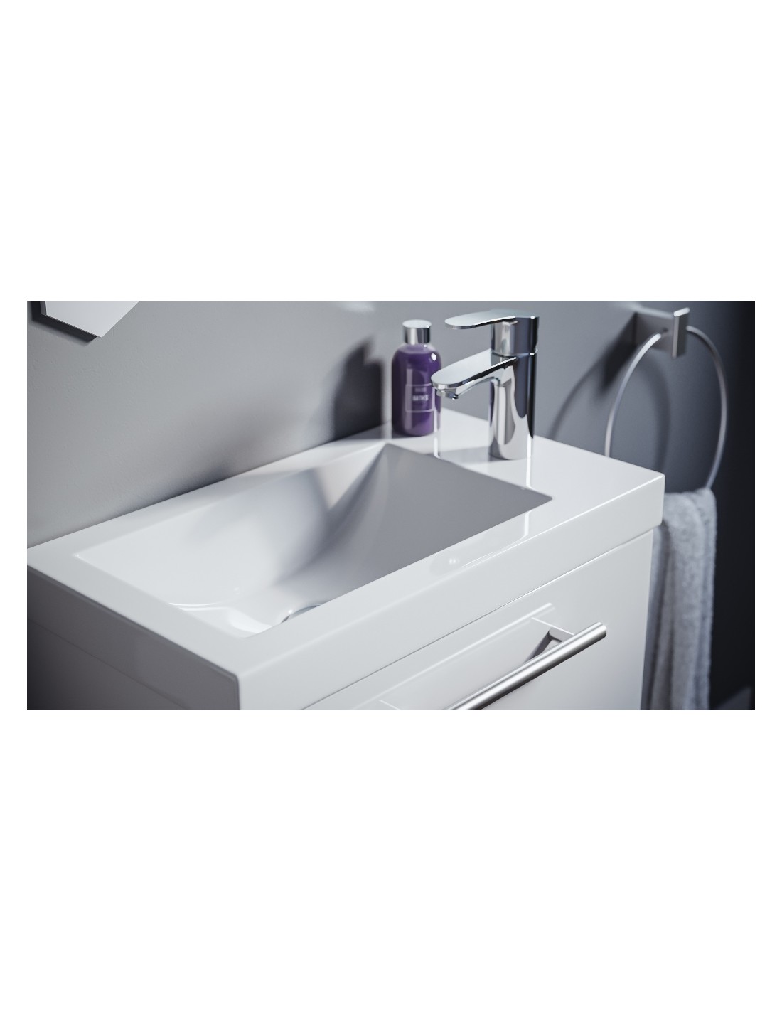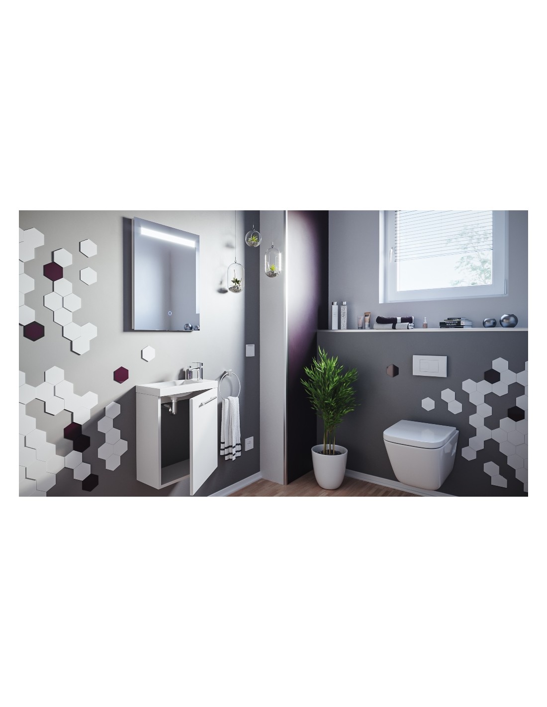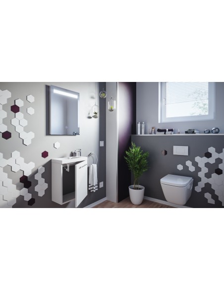 Komplet badmiljø med vask til det lille badeværelse eller gæstetoilet, udført i et design af mdf og mineralsten. Badmiljøet måler 50,5 cm i højden og 40 x 22 cm i bredde og dybde. Spejlet er med 3W lys og touch funktion.