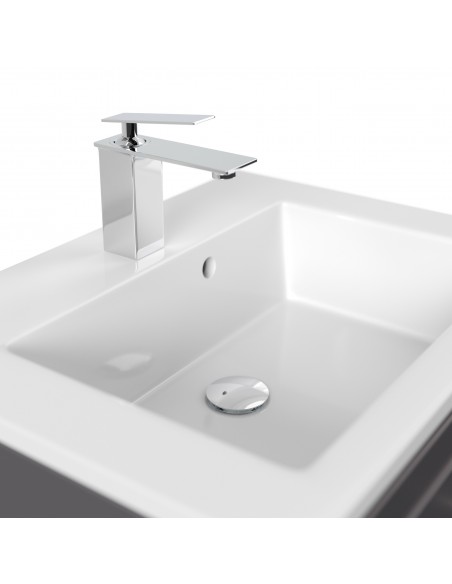 Komplet badmiljø med vask, udført i et design af mdf og mineralsten. Badmiljøet måler 55,6 cm i højden og 61,5 x 46,5 cm i bredde og dybde.