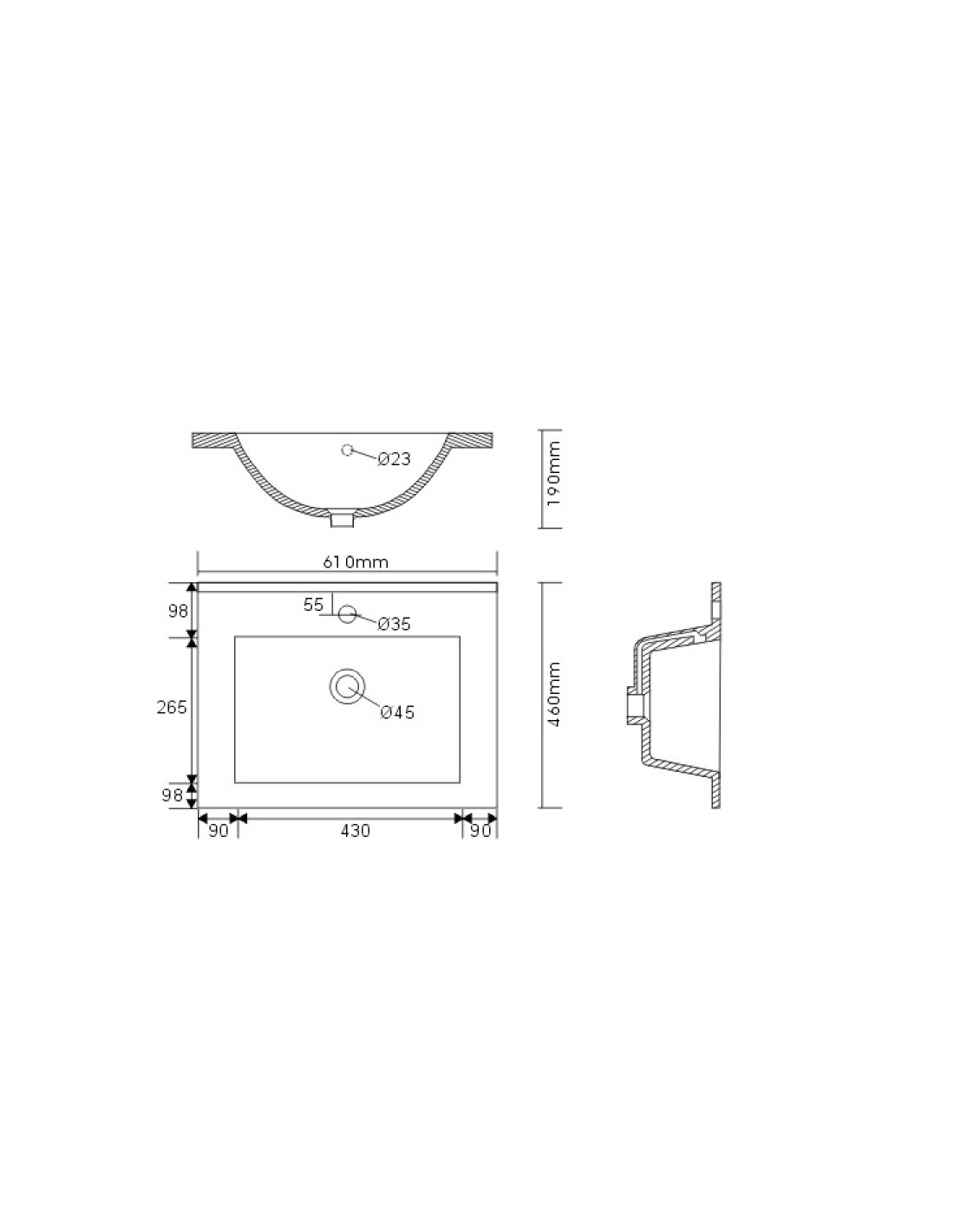 Komplet badmiljø med vask, udført i et design af mdf og mineralsten. Badmiljøet måler 55,6 cm i højden og 61,5 x 46,5 cm i bredde og dybde.