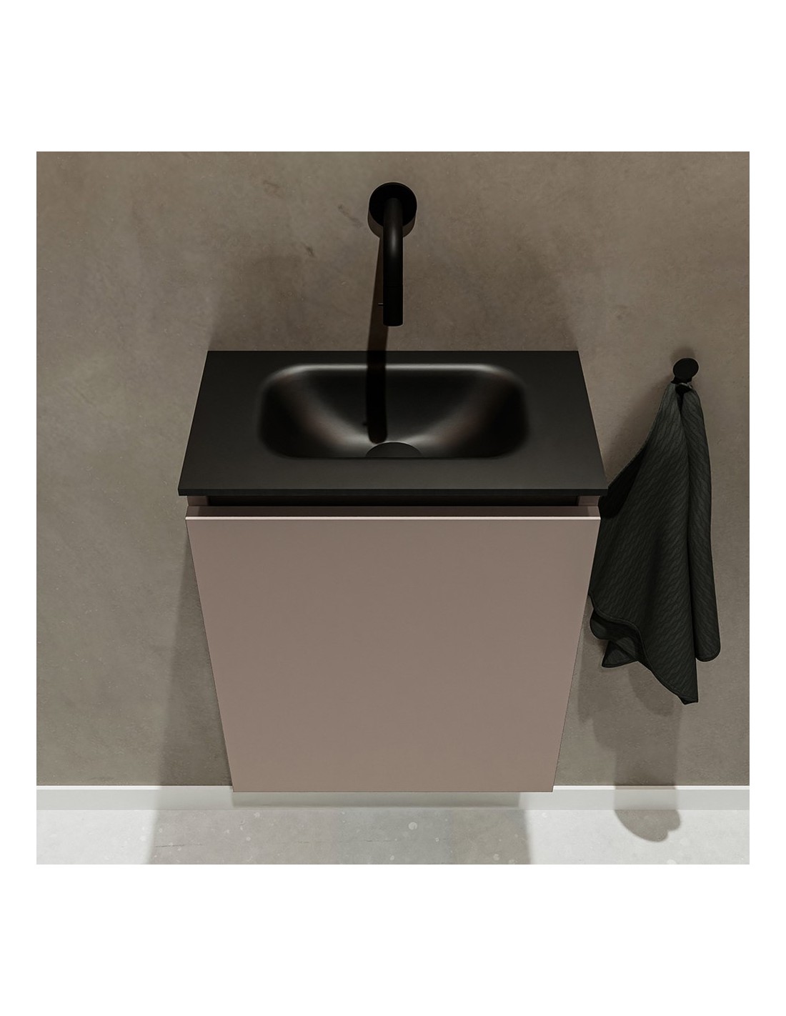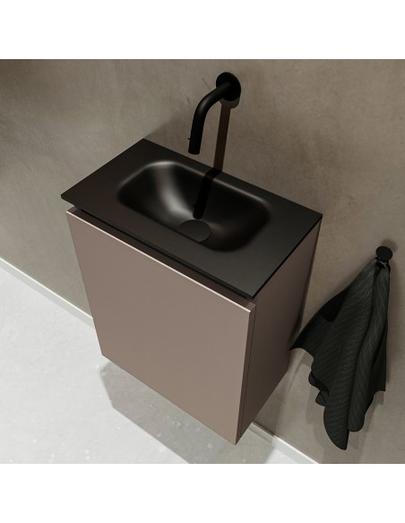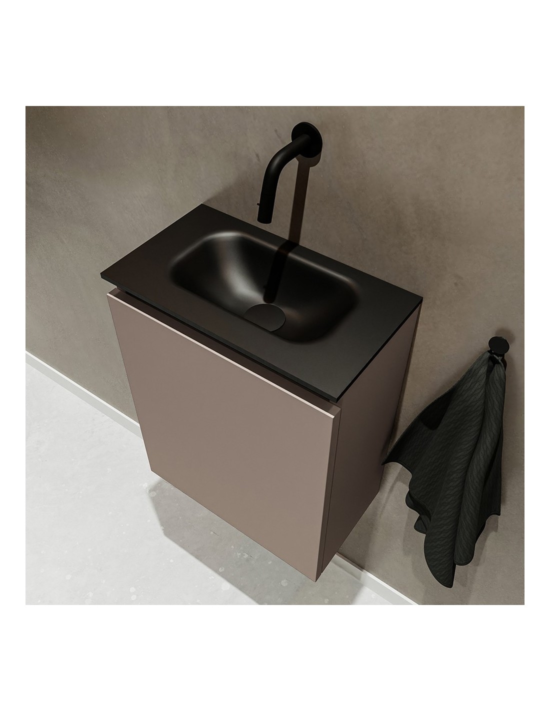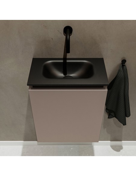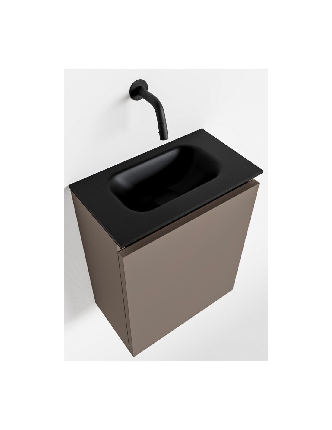TURE Komplet badmiljø med midt centreret håndvask til vægmonteret armatur. Badmiljøet kommer med 1 skab med 1 hylde, og er fremstillet i MDF. Håndvasken er fremstillet i sort solid surface. Badmiljøet måler 40 cm i bredden. Det viste armatur medfølger ikke i sættet.