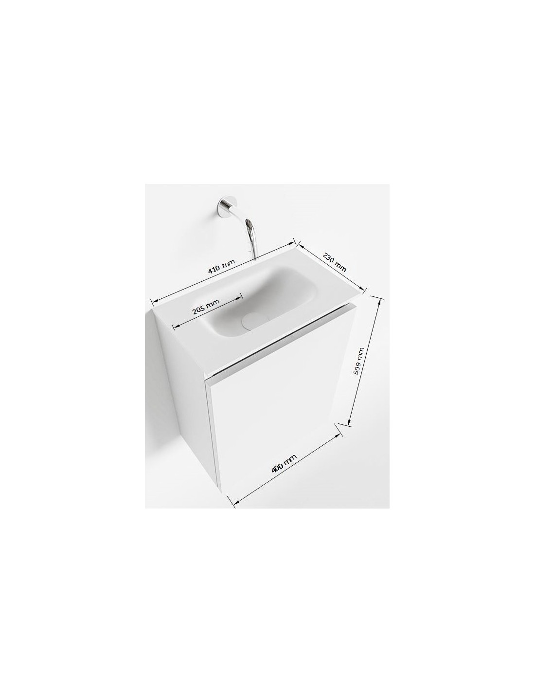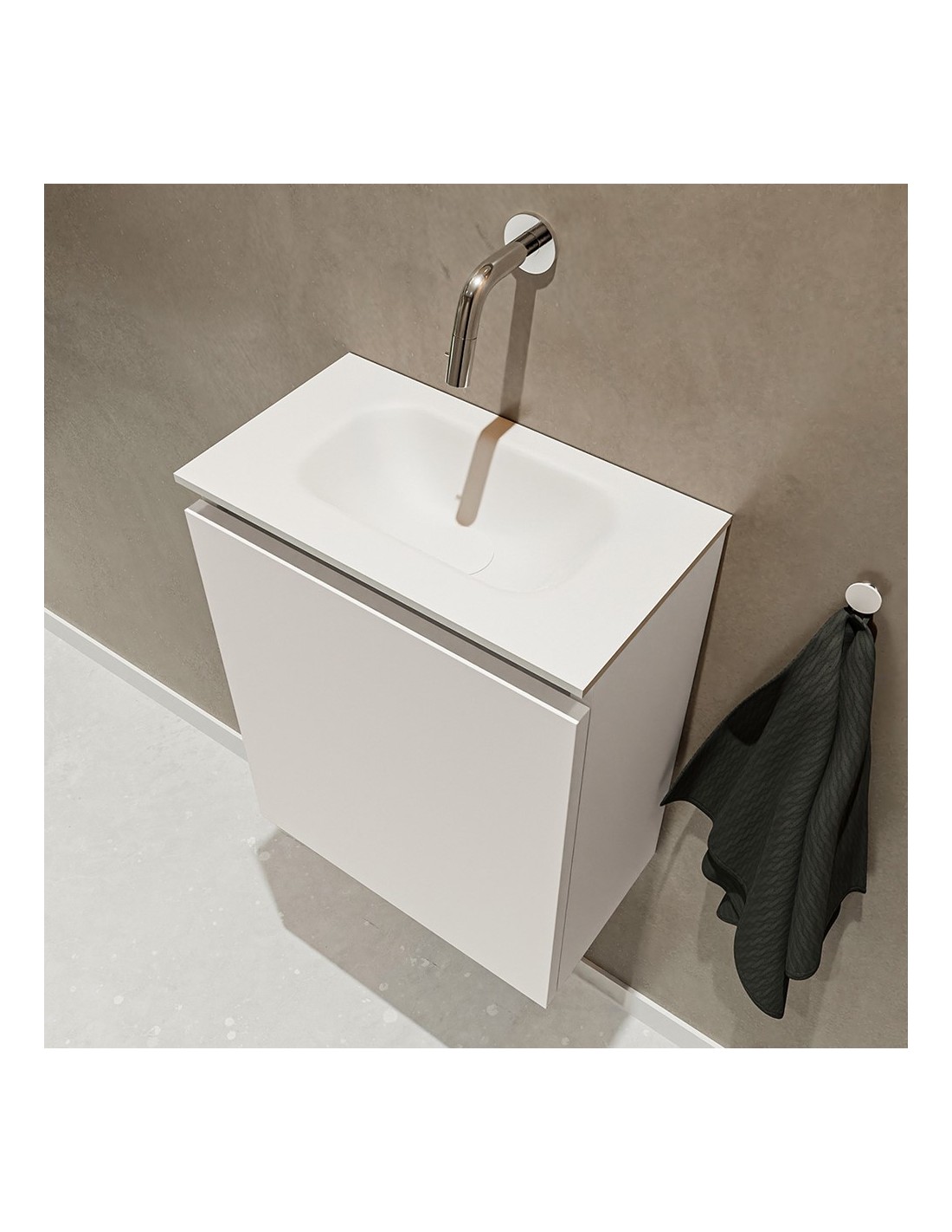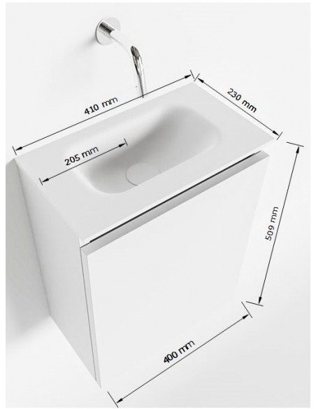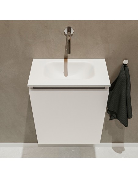 TURE Komplet badmiljø med midt centreret håndvask til vægmonteret armatur. Badmiljøet kommer med 1 skab med 1 hylde, og er fremstillet i MDF. Håndvasken er fremstillet i talkumfarvet (mat hvid) solid surface. Badmiljøet måler 40 cm i bredden. Det viste armatur medfølger ikke i sættet.