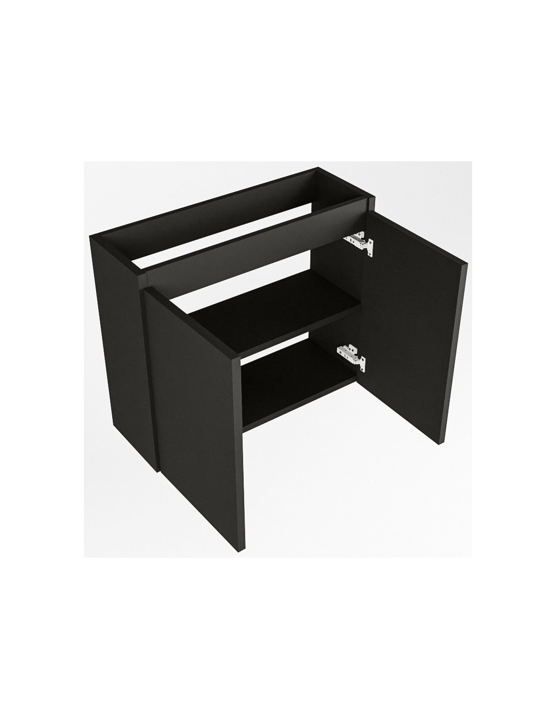 TURE Komplet badmiljø med midt centreret håndvask til bordmonteret armatur. Badmiljøet kommer med 1 dobbeltskab med 1 hylde, og er fremstillet i MDF. Håndvasken er fremstillet i sort solid surface. Badmiljøet måler 60 cm i bredden. Det viste armatur medfølger ikke i sættet.