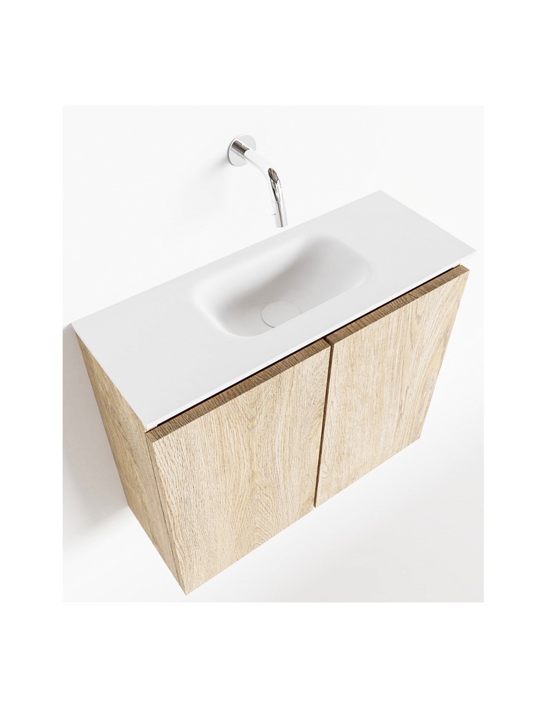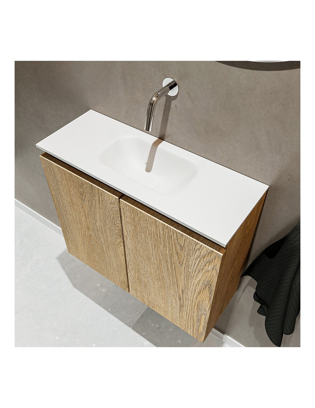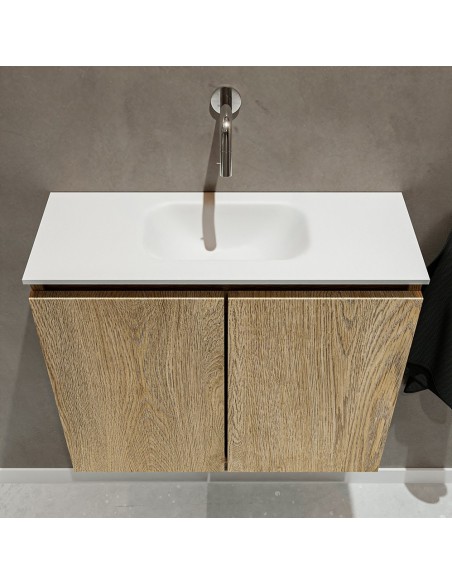 TURE Komplet badmiljø med midt centreret håndvask til vægmonteret armatur. Badmiljøet kommer med 1 dobbeltskab med 1 hylde, og er fremstillet i MDF med design af vasket eg. Håndvasken er fremstillet i talkum farvet (mat hvid) solid surface. Badmiljøet måler 60 cm i bredden. Det viste armatur medfølger ikke i sættet.