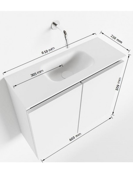 TURE Komplet badmiljø med midt centreret håndvask til bordmonteret armatur. Badmiljøet kommer med 1 dobbeltskab med 1 hylde, og er fremstillet i MDF. Håndvasken er fremstillet i talkum farvet (mat hvid) solid surface. Badmiljøet måler 60 cm i bredden. Det viste armatur medfølger ikke i sættet.