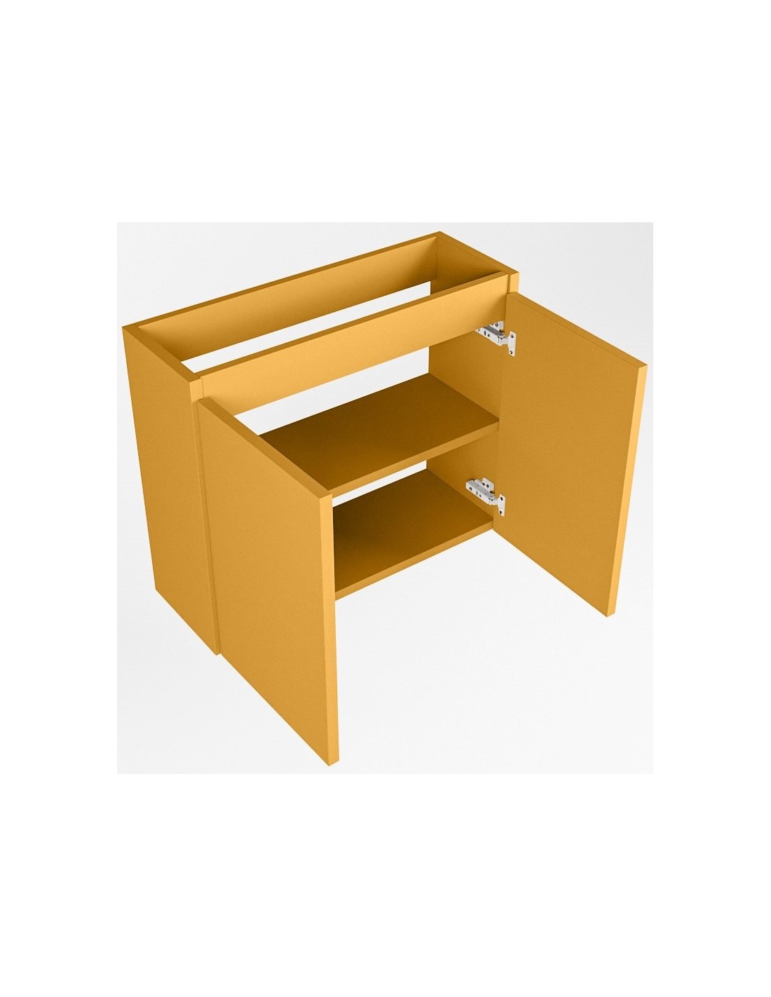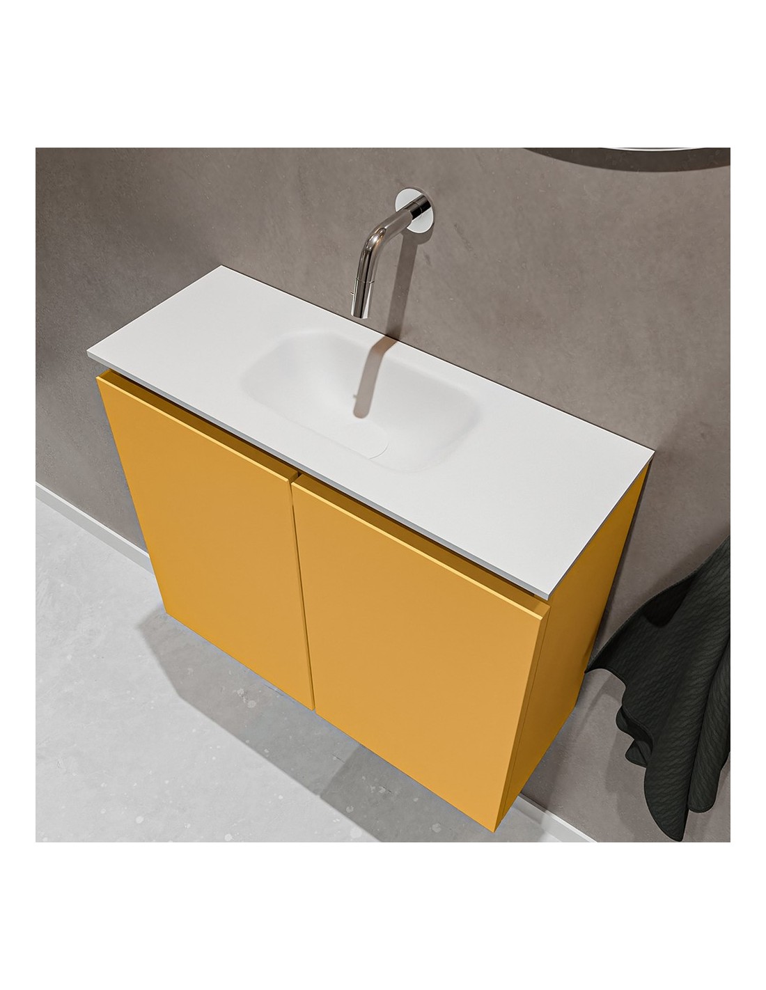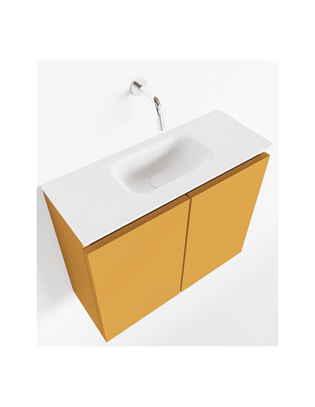 TURE Komplet badmiljø med midt centreret håndvask til vægmonteret armatur. Badmiljøet kommer med 1 dobbeltskab med 1 hylde, og er fremstillet i MDF. Håndvasken er fremstillet i talkum farvet (mat hvid) solid surface. Badmiljøet måler 60 cm i bredden. Det viste armatur medfølger ikke i sættet.