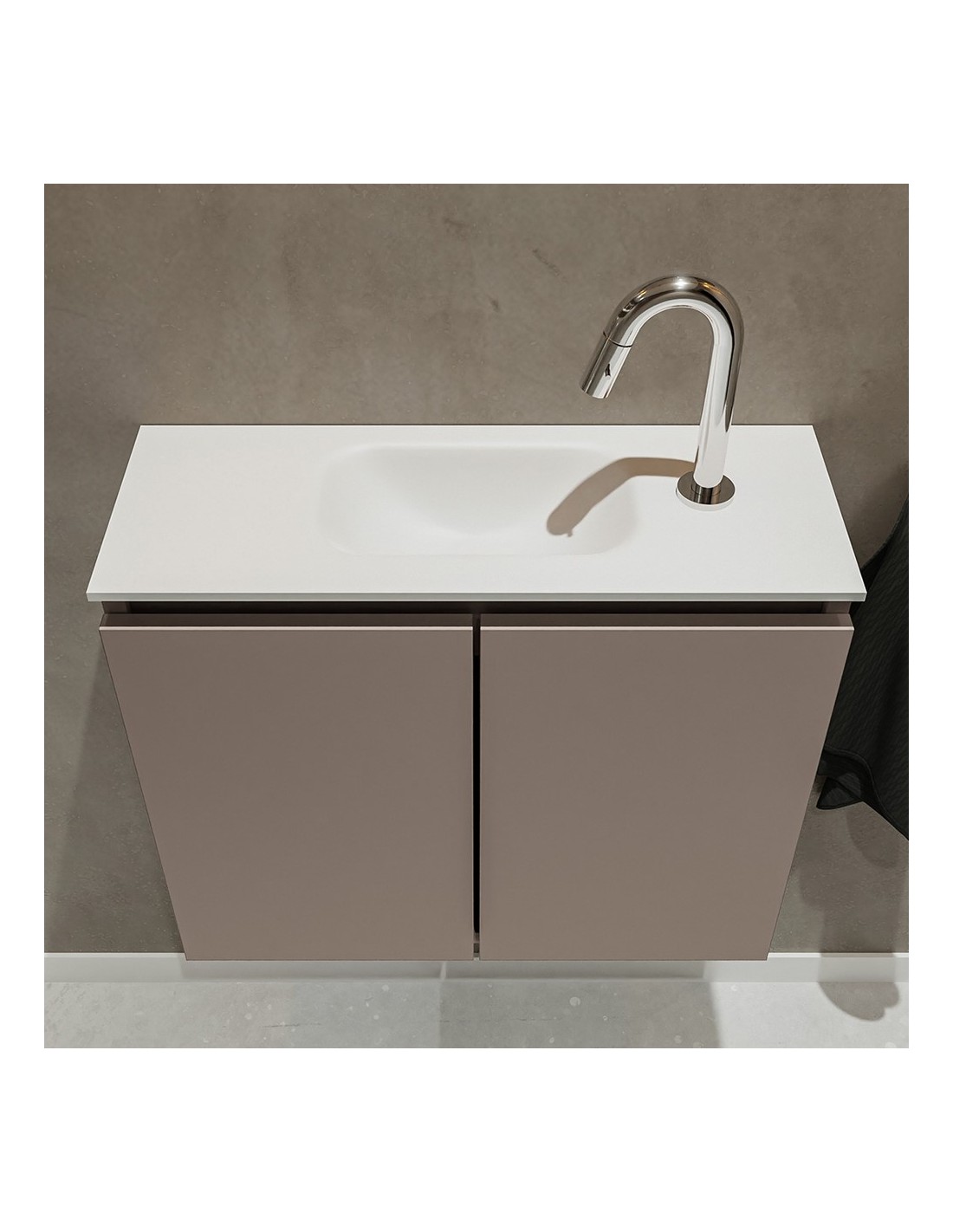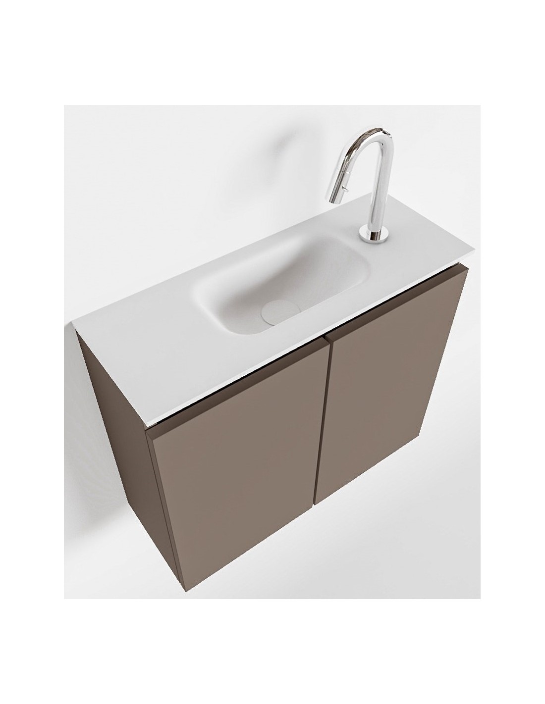 TURE Komplet badmiljø med midt centreret håndvask til bordmonteret armatur. Badmiljøet kommer med 1 dobbeltskab med 1 hylde, og er fremstillet i MDF. Håndvasken er fremstillet i talkum farvet (mat hvid) solid surface. Badmiljøet måler 60 cm i bredden. Det viste armatur medfølger ikke i sættet.