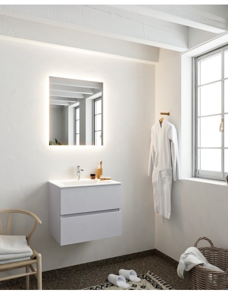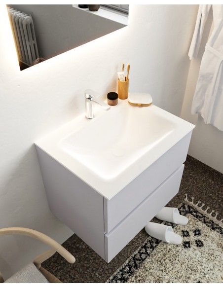 VICA Komplet badmiljø med midt centreret håndvask til bordmonteret armatur. Badmiljøet kommer med 2 skuffer med fuldt udtræk, og er fremstillet i MDF. Håndvasken er fremstillet i talkum farvet (mat hvid) solid surface. Badmiljøet måler 60 cm i bredden. Det viste armatur medfølger ikke i sættet.