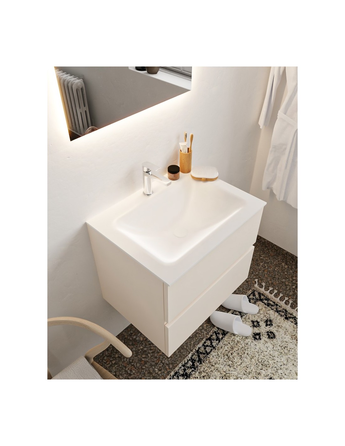 VICA Komplet badmiljø med midt centreret håndvask til bordmonteret armatur. Badmiljøet kommer med 2 skuffer med fuldt udtræk, og er fremstillet i MDF. Håndvasken er fremstillet i talkum farvet (mat hvid) solid surface. Badmiljøet måler 60 cm i bredden. Det viste armatur medfølger ikke i sættet.