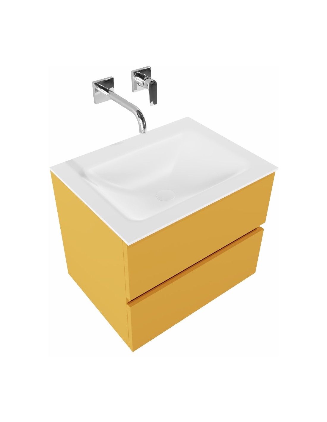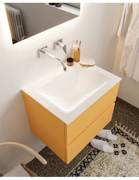 VICA Komplet badmiljø med midt centreret håndvask til vægmonteret armatur. Badmiljøet kommer med 2 skuffer med fuldt udtræk, og er fremstillet i MDF. Håndvasken er fremstillet i talkum farvet (mat hvid) solid surface. Badmiljøet måler 60 cm i bredden. Det viste armatur medfølger ikke i sættet.