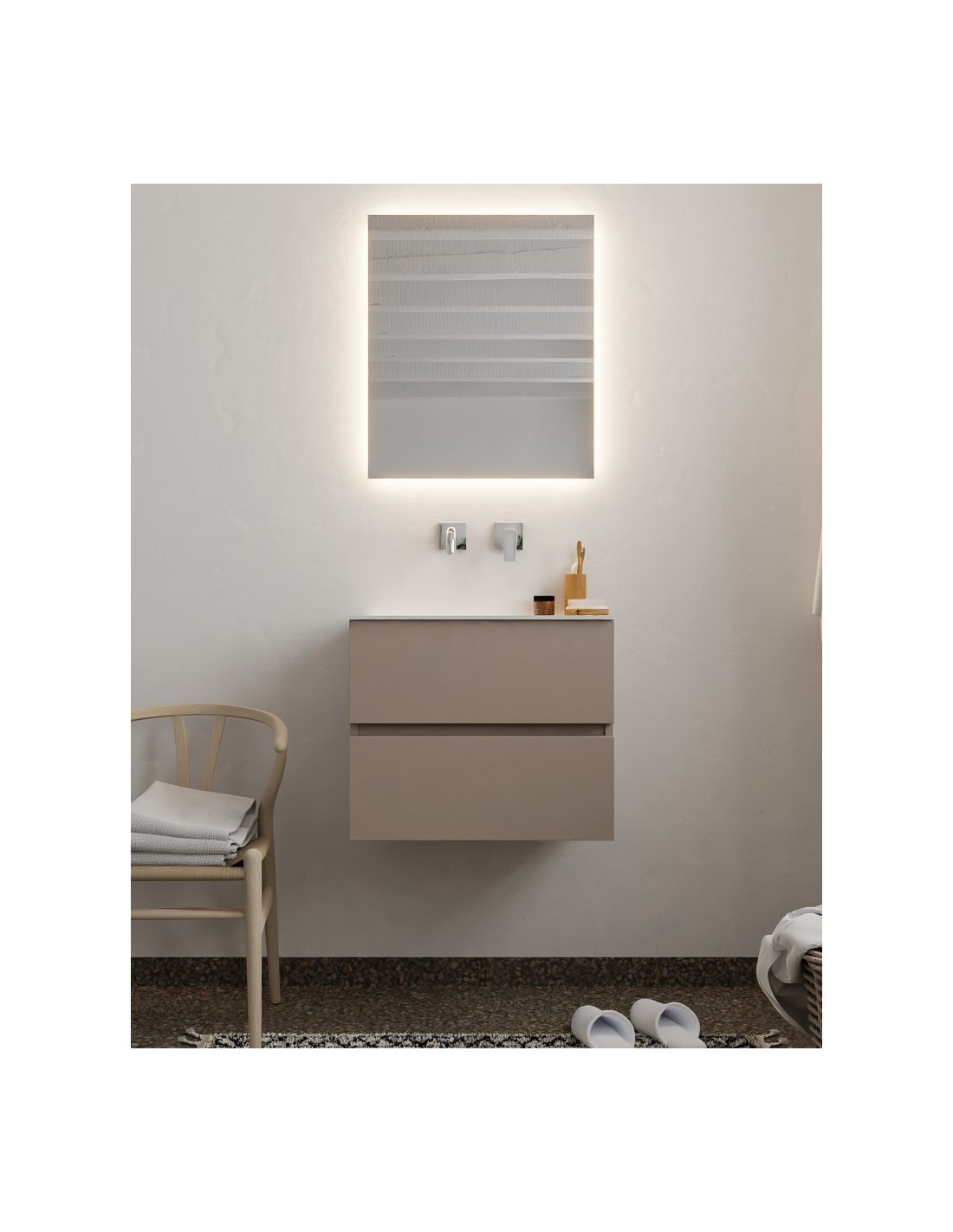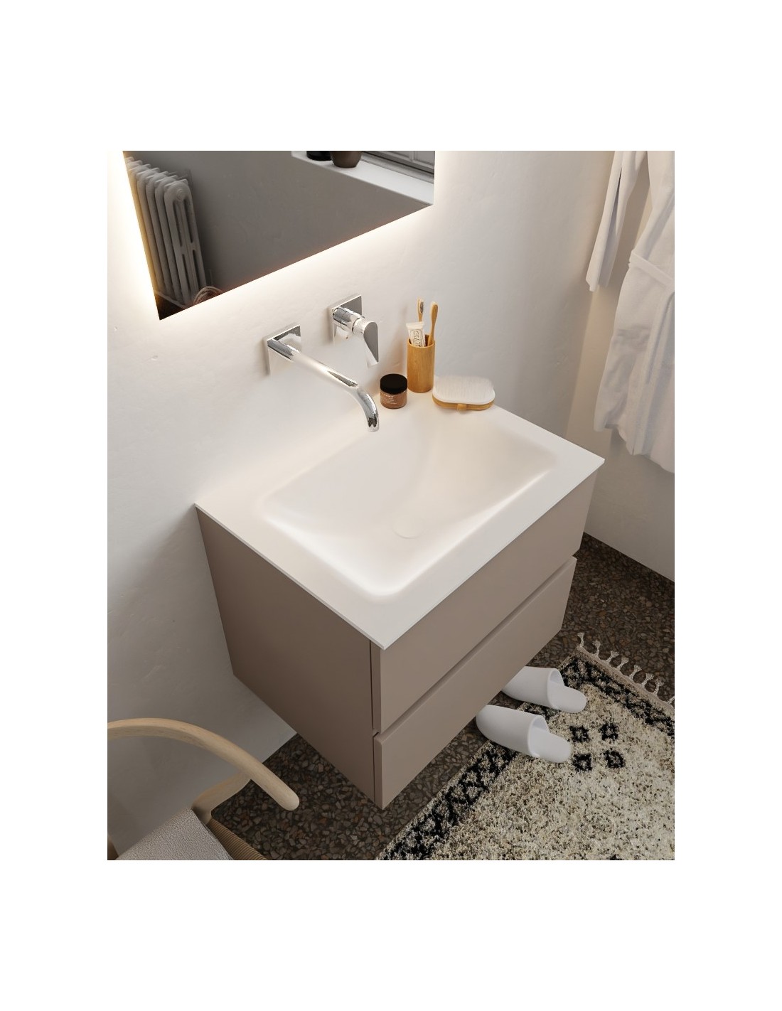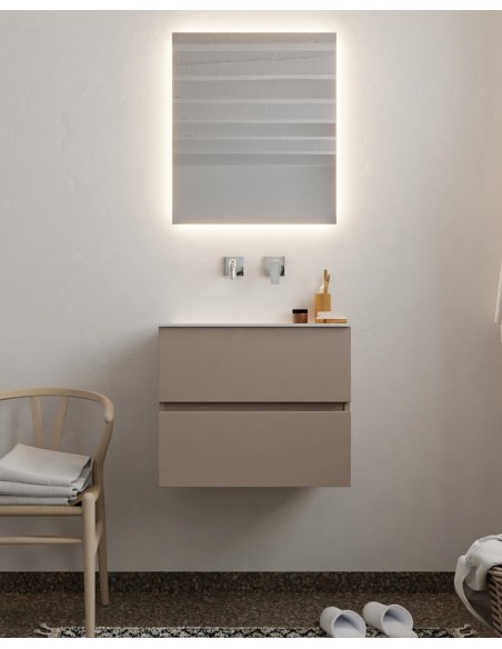 VICA Komplet badmiljø med midt centreret håndvask til vægmonteret armatur. Badmiljøet kommer med 2 skuffer med fuldt udtræk, og er fremstillet i MDF. Håndvasken er fremstillet i talkum farvet (mat hvid) solid surface. Badmiljøet måler 60 cm i bredden. Det viste armatur medfølger ikke i sættet.