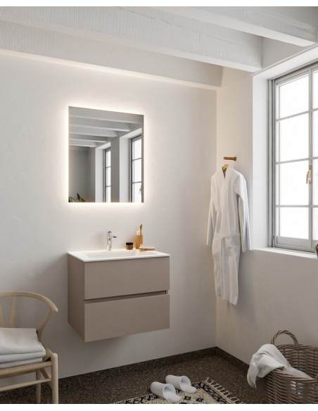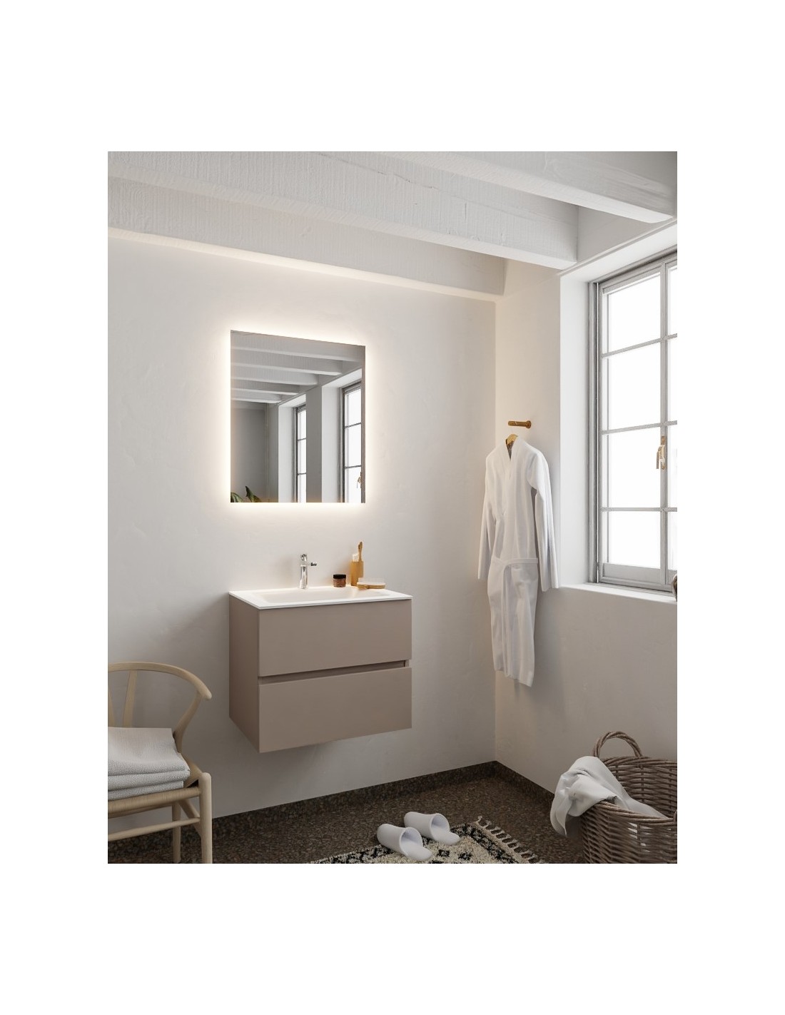 VICA Komplet badmiljø med midt centreret håndvask til bordmonteret armatur. Badmiljøet kommer med 2 skuffer med fuldt udtræk, og er fremstillet i MDF. Håndvasken er fremstillet i talkum farvet (mat hvid) solid surface. Badmiljøet måler 60 cm i bredden. Det viste armatur medfølger ikke i sættet.