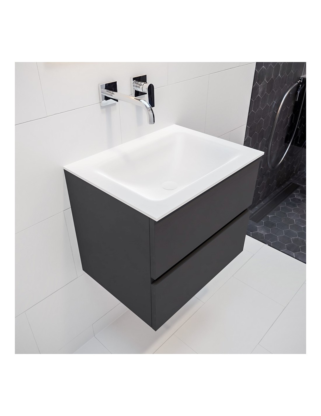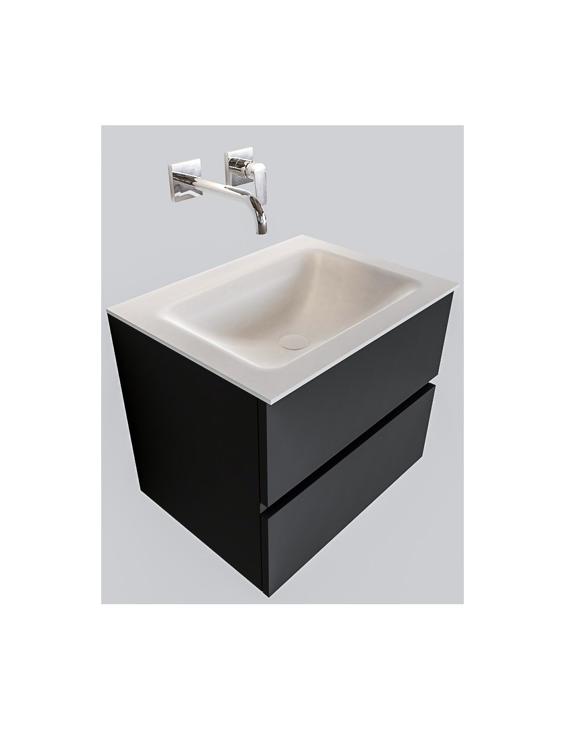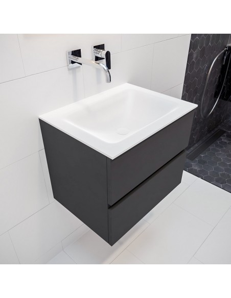 VICA Komplet badmiljø med midt centreret håndvask til vægmonteret armatur. Badmiljøet kommer med 2 skuffer med fuldt udtræk, og er fremstillet i MDF. Håndvasken er fremstillet i talkum farvet (mat hvid) solid surface. Badmiljøet måler 60 cm i bredden. Det viste armatur medfølger ikke i sættet.