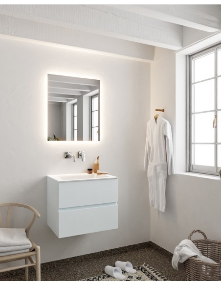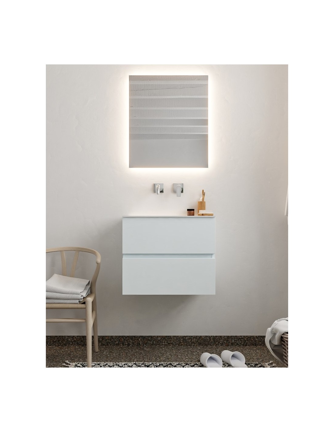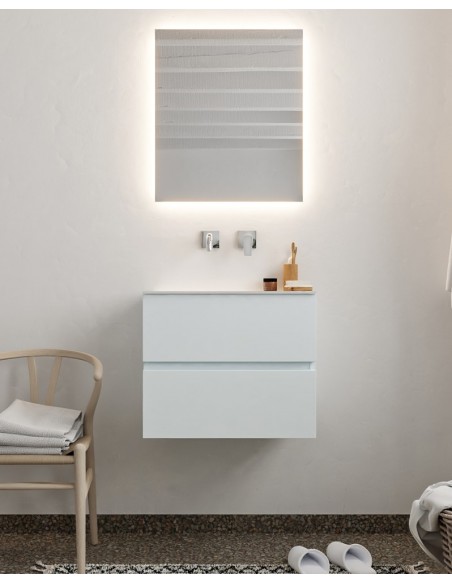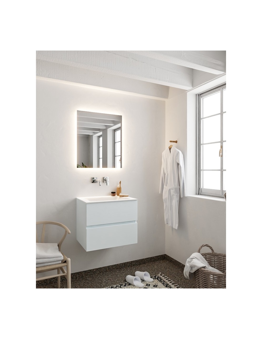 VICA Komplet badmiljø med midt centreret håndvask til vægmonteret armatur. Badmiljøet kommer med 2 skuffer med fuldt udtræk, og er fremstillet i MDF. Håndvasken er fremstillet i talkum farvet (mat hvid) solid surface. Badmiljøet måler 60 cm i bredden. Det viste armatur medfølger ikke i sættet.