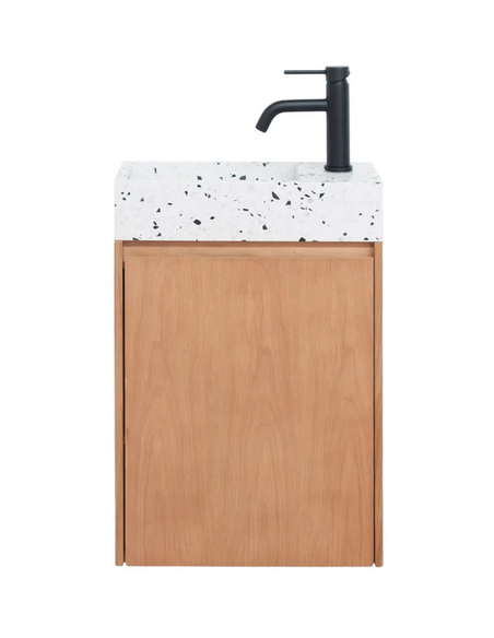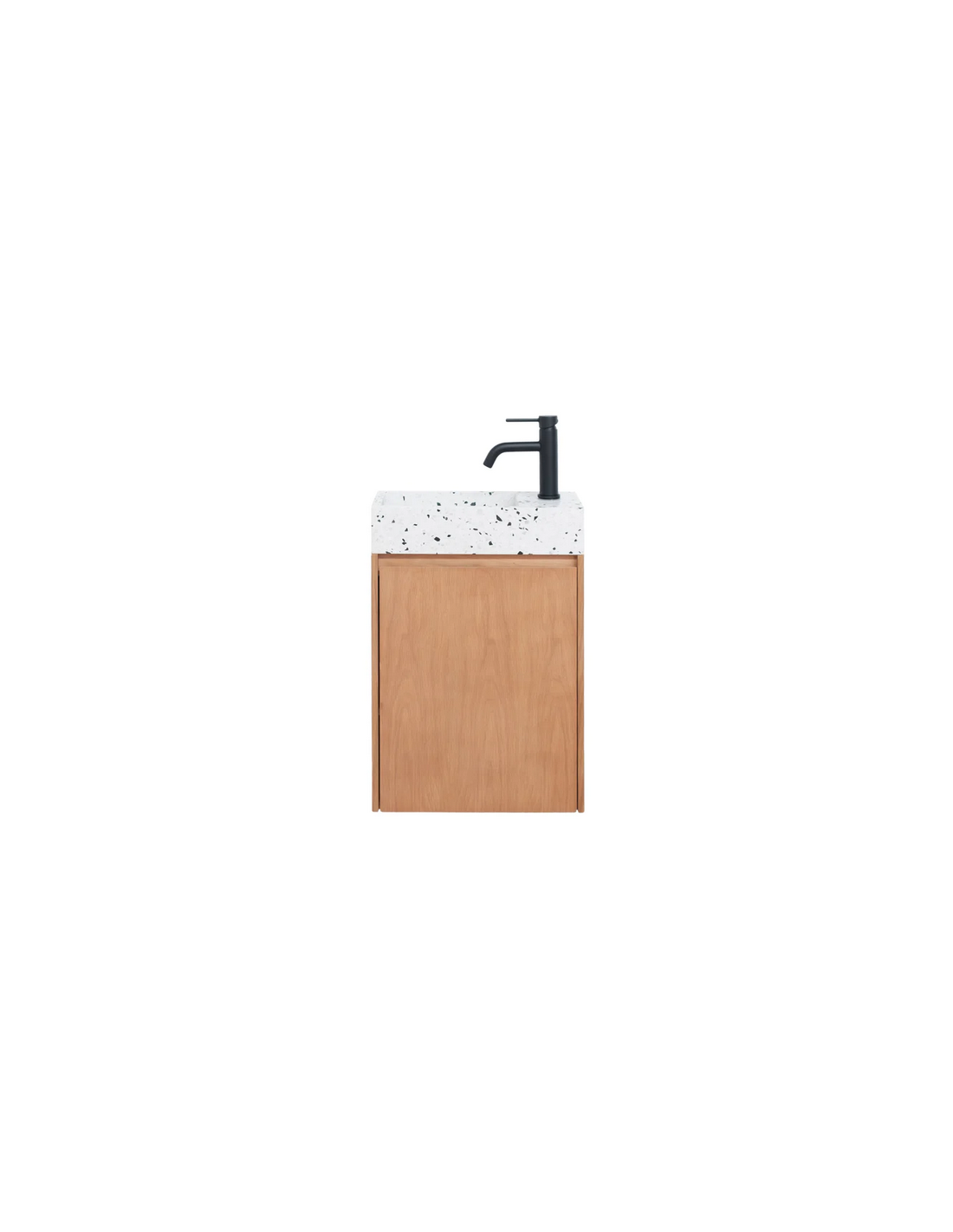 Vægmonteret komplet badmiljø udført i et design af egetræsfarvet MDF og hvid terrazzo. Sættet måler 65 cm i højden og 45 x 22 cm i bredde og dybde (ydermål). Vasken leveres uden bundventil (standard mål). I skabet forefindes 1 hylde (2 hylderum) og skabslågen åbnes til højre.