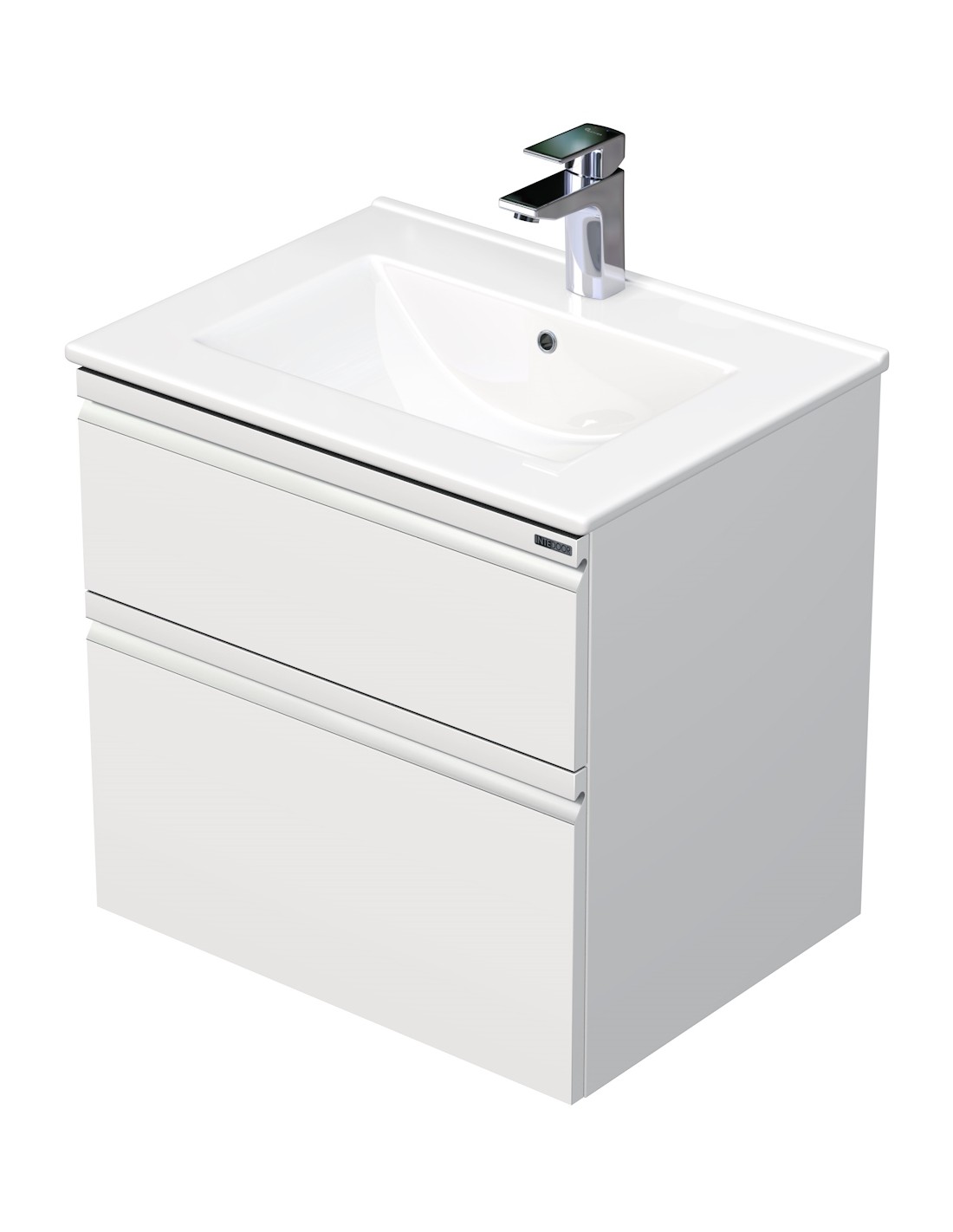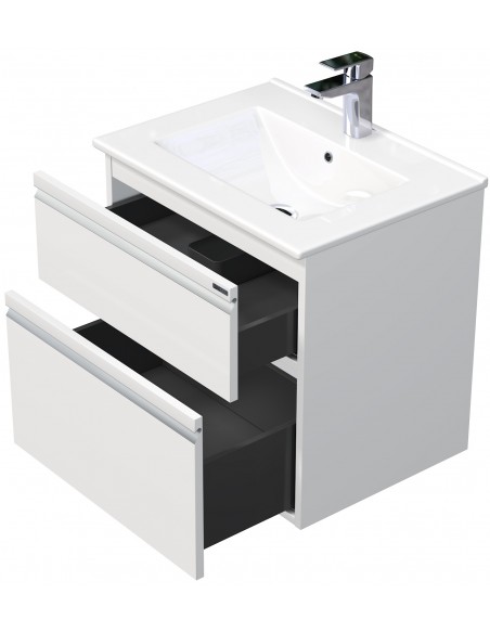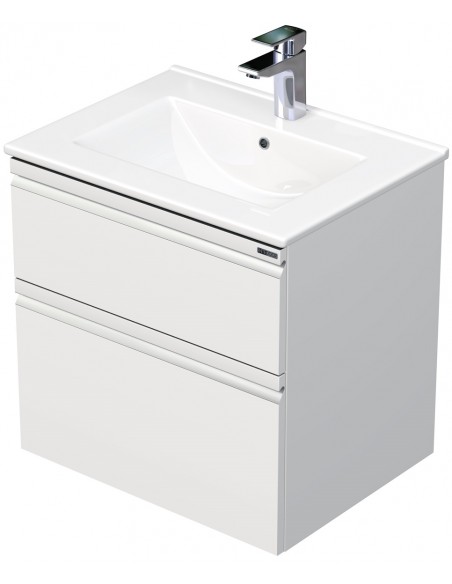 BRAVE Komplet badmiljø med håndvask til bordmonteret armatur. Badmiljøet kommer med 2 skuffer med softclose og er fremstillet i MDF. Håndvasken er fremstillet i hvid keramik. Badmiljøet måler 60 / 61 cm i bredden. Det viste armatur medfølger ikke i sættet.