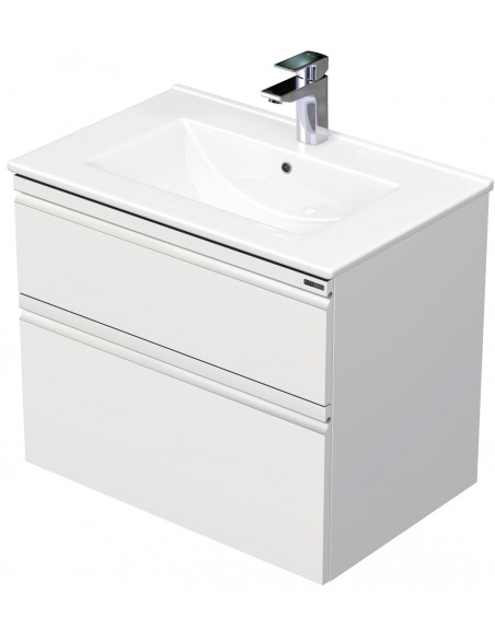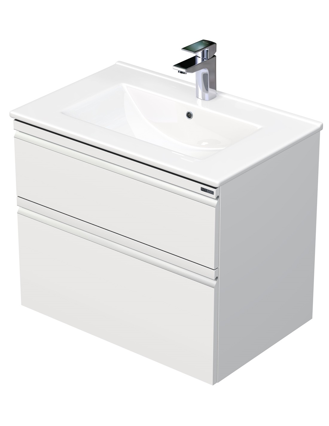 BRAVE Komplet badmiljø med håndvask til bordmonteret armatur. Badmiljøet kommer med 2 skuffer med softclose og er fremstillet i MDF. Håndvasken er fremstillet i hvid keramik. Badmiljøet måler 70 / 71 cm i bredden. Det viste armatur medfølger ikke i sættet.
