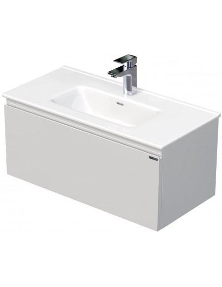 LETTY Mini Komplet badmiljø med håndvask til bordmonteret armatur. Badmiljøet kommer med 1 skuffe med softclose og er fremstillet i MDF. Håndvasken er fremstillet i hvid keramik. Badmiljøet måler 80 / 81 cm i bredden. Det viste armatur medfølger ikke i sættet.