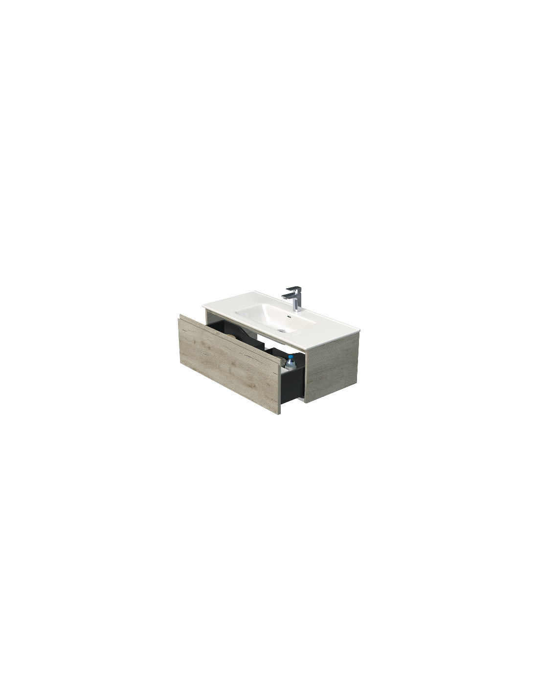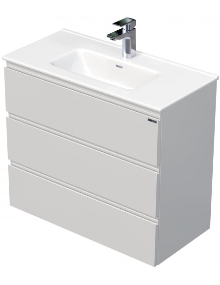 LETTY Mini Komplet badmiljø med håndvask til bordmonteret armatur. Badmiljøet kommer med 3 skuffer med softclose og er fremstillet i MDF. Håndvasken er fremstillet i hvid keramik. Badmiljøet måler 80 / 81 cm i bredden. Det viste armatur medfølger ikke i sættet.