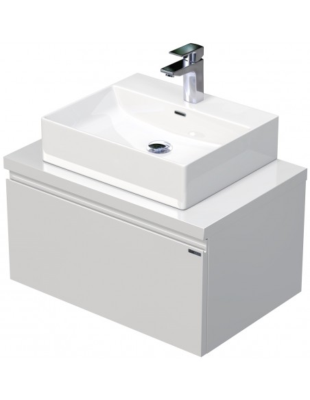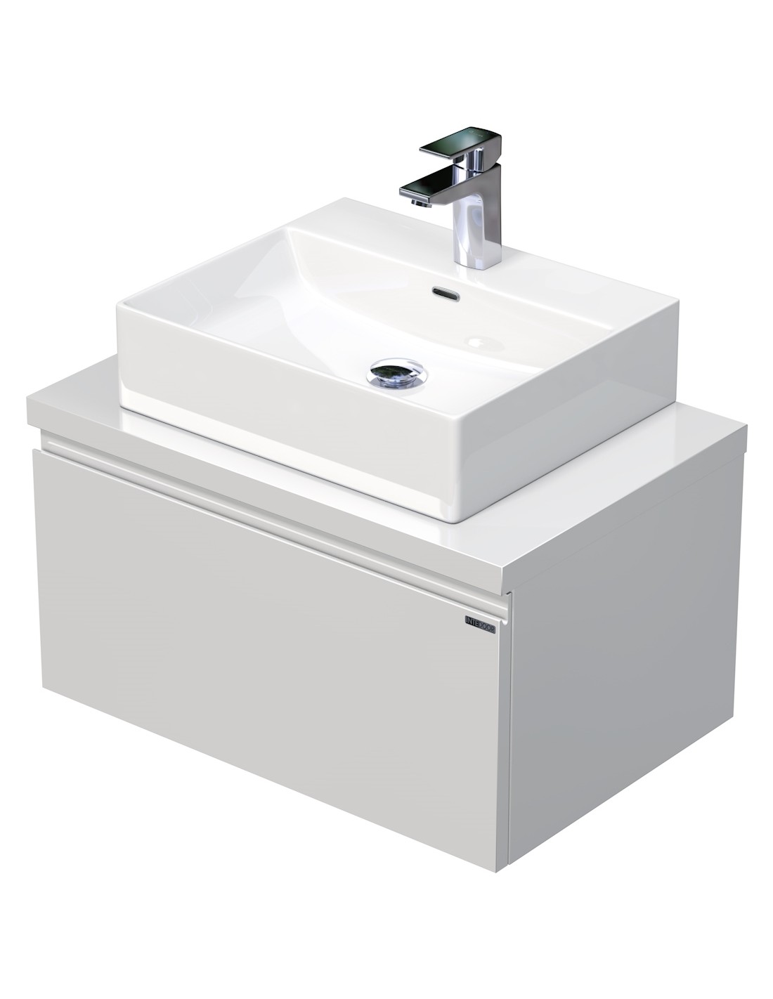 LETTY Komplet badmiljø med håndvask til bordmonteret armatur. Badmiljøet kommer med 1 skuffe med softclose og er fremstillet i MDF. Håndvasken er fremstillet i hvid keramik. Badmiljøet måler 70 cm i bredden. Det viste armatur medfølger ikke i sættet.