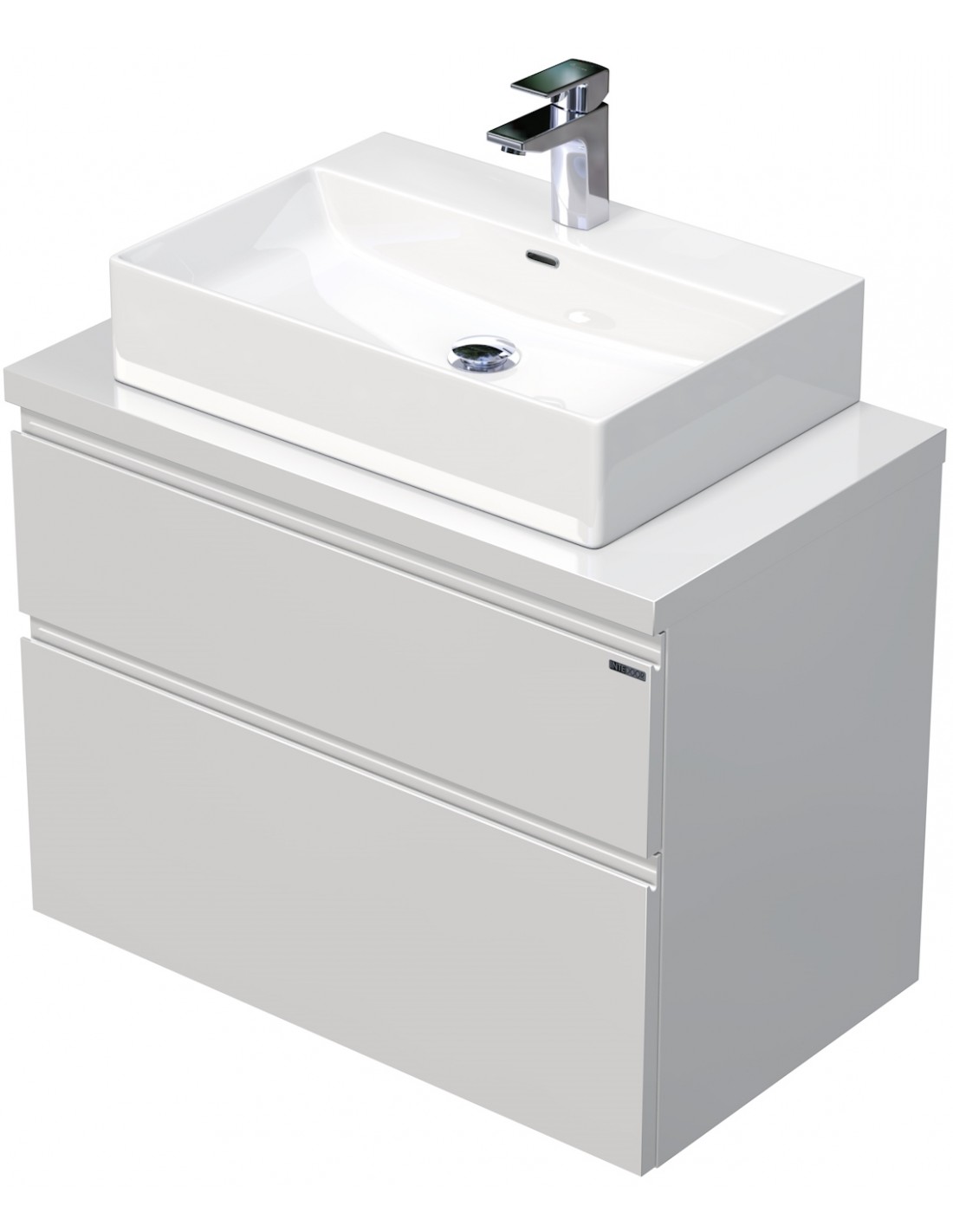 LETTY Komplet badmiljø med håndvask til bordmonteret armatur. Badmiljøet kommer med 2 skuffer med softclose og er fremstillet i MDF. Håndvasken er fremstillet i hvid keramik. Badmiljøet måler 80 cm i bredden. Det viste armatur medfølger ikke i sættet.