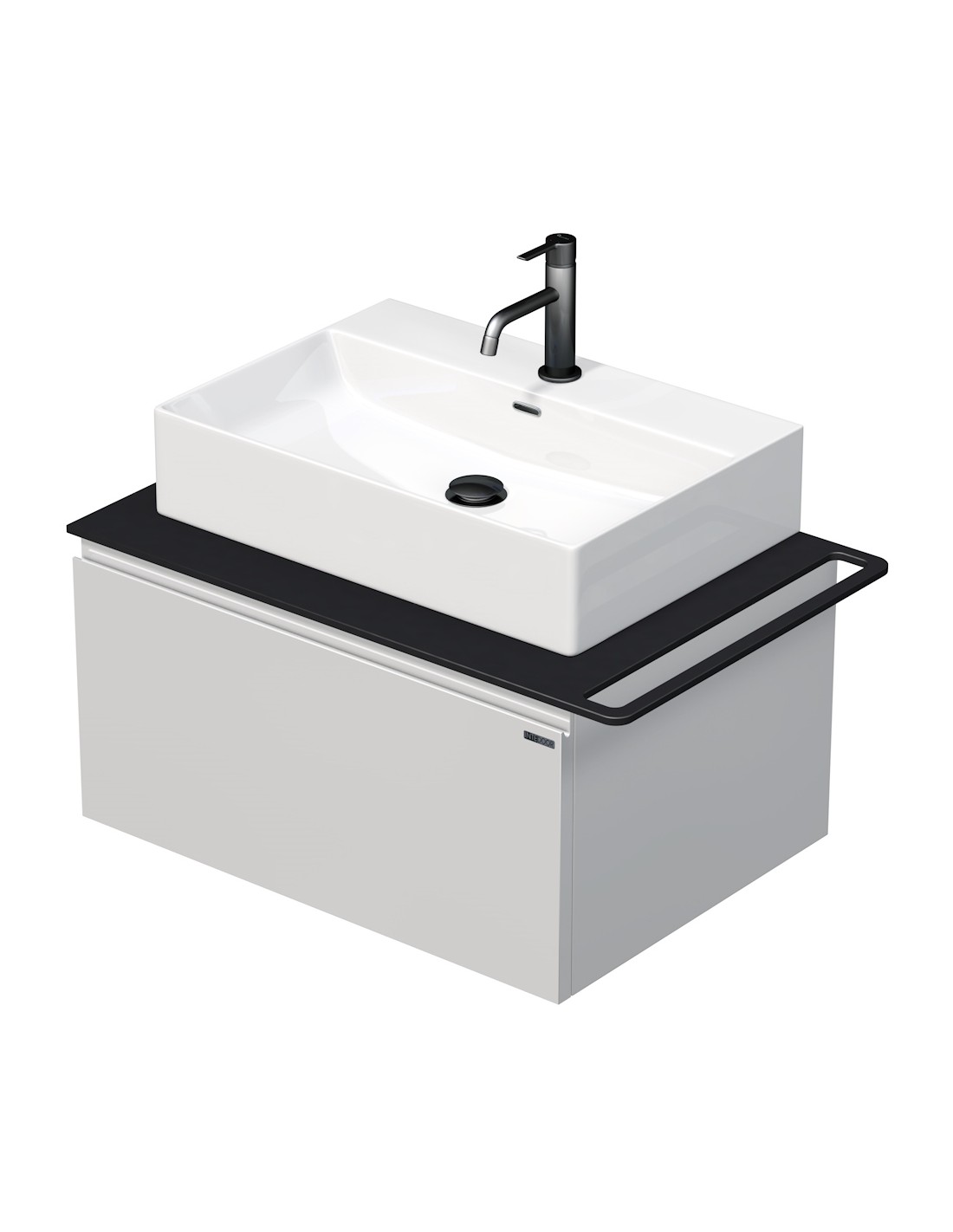 TARA Komplet badmiljø med 1 håndvask til bordmonteret armaturer. Badmiljøet kommer med 1 skuffe med softclose og er fremstillet i HPL og MDF. Håndvasken er fremstillet i keramik. Badmiljøet måler 78 cm i bredden. Det viste armatur og bundventil medfølger ikke i sættet.